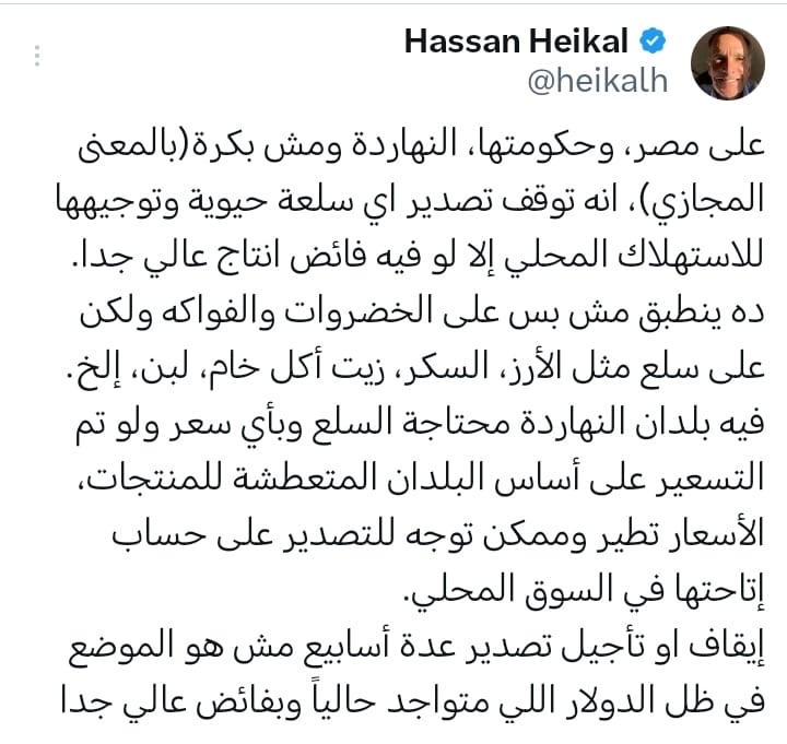 وكتب هيكل عبر حسابه على "إكس" : على مصر، وحكومتها، النهاردة ومش بكرة (بالمعنى المجازي)، انه توقف تصدير اي سلعة حيوية وتوجيهها للاستهلاك المحلي إلا لو فيه فائض انتاج عالي جدا.
