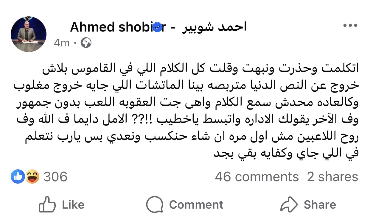 وكتب شوبير عبر حسابه الشخصي بموقع فيسبوك: “اتكلمت وحذرت ونبهت وقلت كل الكلام اللي في القاموس بلاش خروج عن النص الدنيا متربصه بينا الماتشات اللي جايه خروج مغلوب وكالعادة محدش سمع الكلام”.