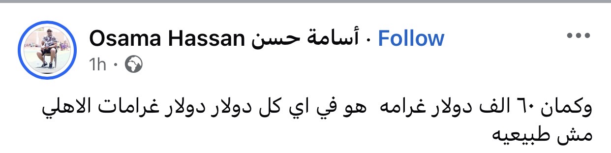 وكتب اسامة حسن عبر حسابه علي فيسبوك" ٦٠ الف دولار غرامه هو في اي كل دى دولارات غرامات علي الاهلي حاجة مش طبيعية"