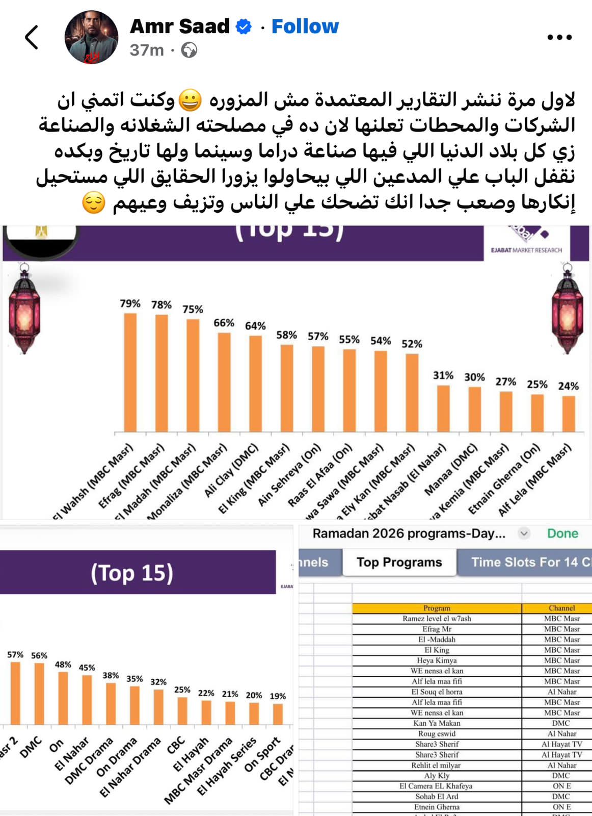 شارك النجم عمرو سعد، التقارير المعتمدة من Ejabat والذى كشف عن تصدر مسلسل إفراج المذاع على قناة MBC مصر أعلى نسب مشاهدة في الموسم الرمضاني لعام 2026.