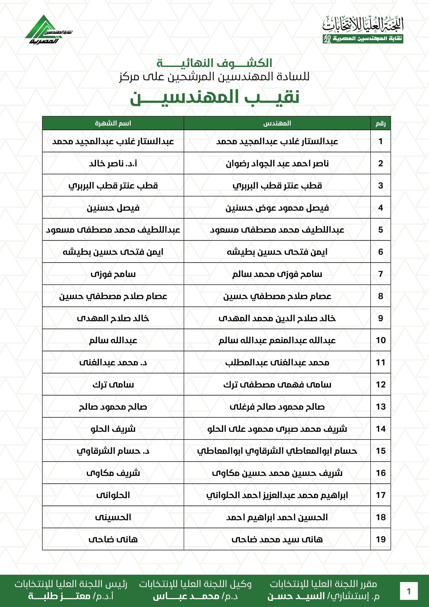 وجاءت أسماء المرشحين لمنصب نقيب عام المهندسين الـ 19، كالتالي :