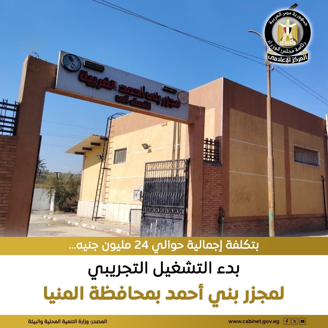 أعلنت وزارة التنمية المحلية والبيئة، عن التشغيل التجريبي لمجزر بني أحمد بمحافظة المنيا، وذلك بتكلفة إجمالية حوالي 24 مليون جنيه، ضمن موازنة الوزارة لتنفيذ المشروع القومي لتطوير ورفع كفاءة المجازر الحكومية بجميع المحافظات.