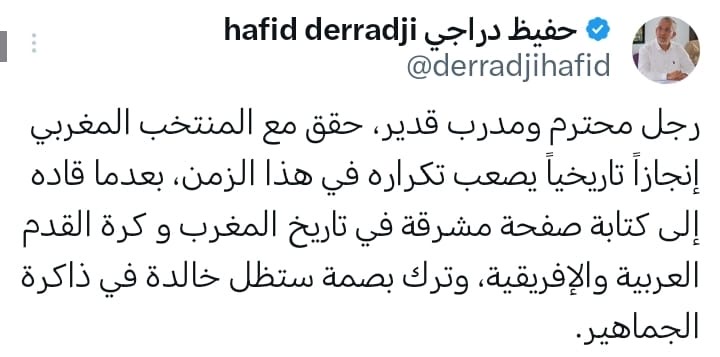 وكتب حفيظ دراجي في تغريدة له عبر حسابه الرسمي على موقع التواصل الاجتماعي "إكس": “رجل محترم ومدرب قدير، حقق مع المنتخب المغربي إنجازاً تاريخياً يصعب تكراره في هذا الزمن، بعدما قاده إلى كتابة صفحة مشرقة في تاريخ المغرب و كرة القدم العربية والإفريقية، وترك بصمة ستظل خالدة في ذاكرة الجماهير”