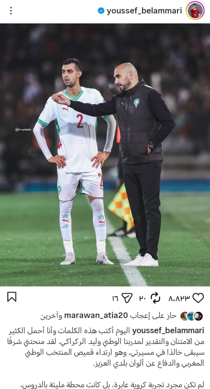 وختم بلعمري قائلاً:"أتمنى لك كل التوفيق في مسارك القادم، وستبقى دائمًا جزءًا من قصة جميلة عشناها معًا بقميص المنتخب. ديما مغرب."