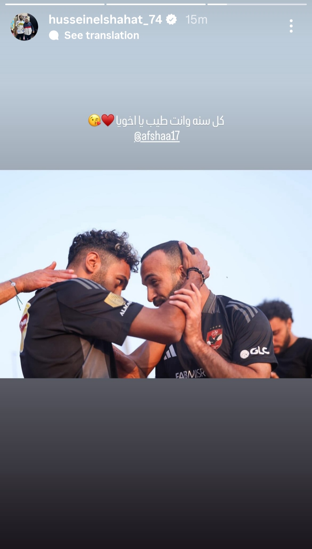 حرص نجم الأهلي حسين الشحات على تهنئة محمد مجدي أفشة، لاعب الاتحاد السكندري بمناسبة عيد ميلاده، عبر حسابه الشخصي بموقع التواصل الإجتماعي إنستجرام.
