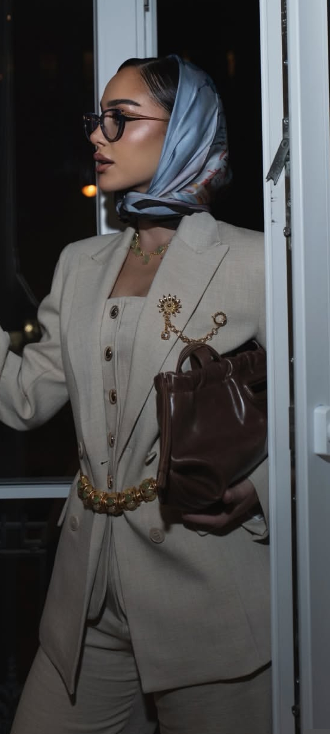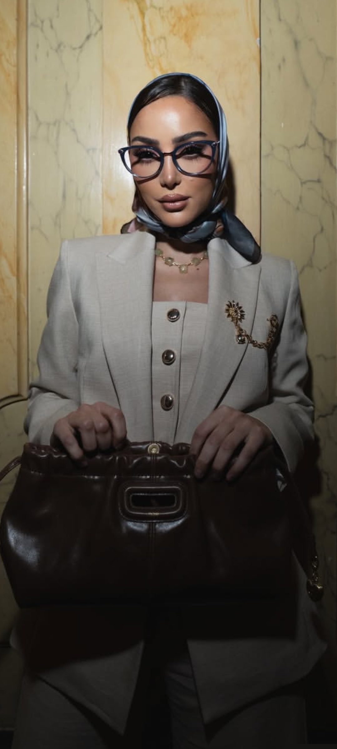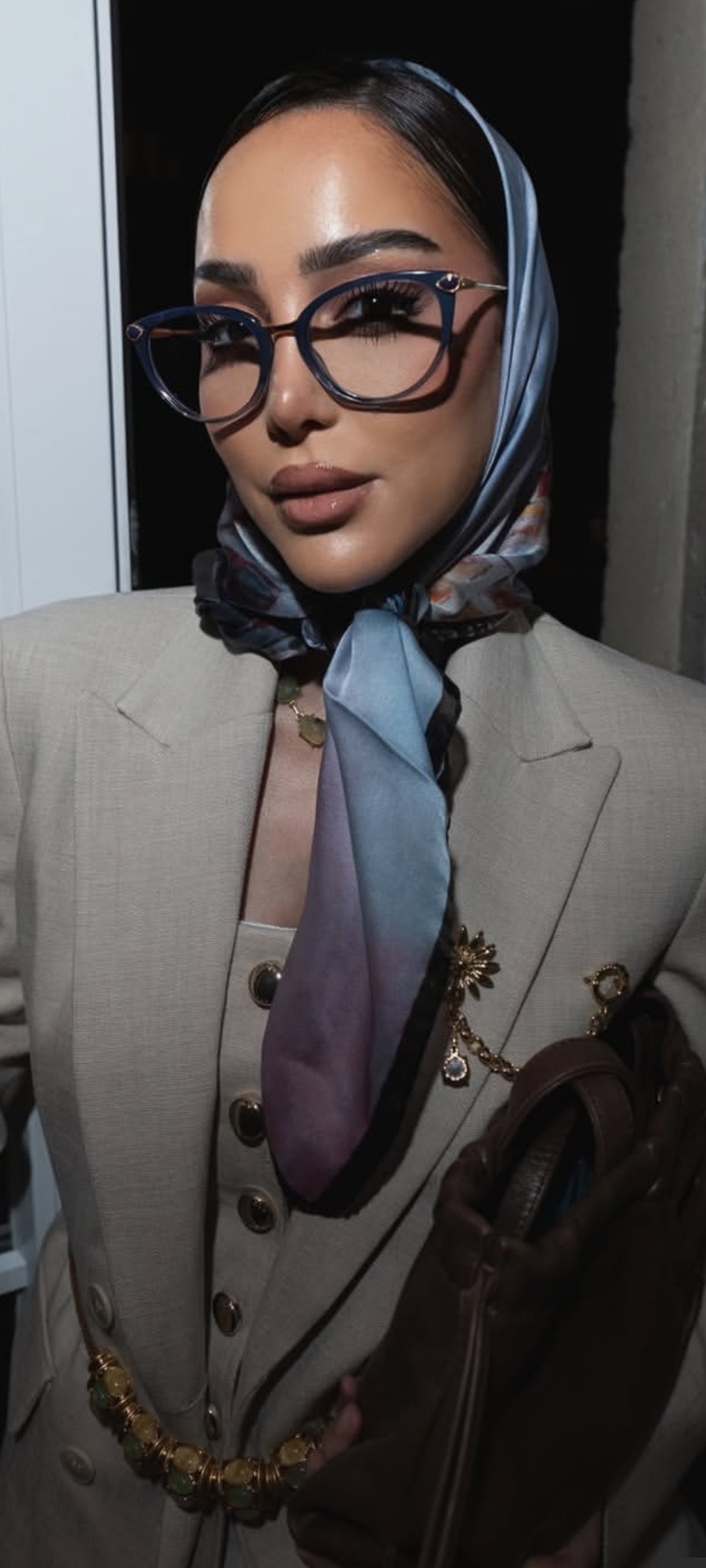 واختارت تسريحة مميزة لشعرها، مع وضع تربون على شعرها بألوان ناعمة لتتناسب مع اللوك الذي تظهر به.