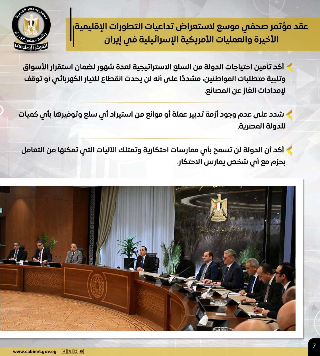 وعقد رئيس الوزراء، مؤتمرًا صحفيًا موسعًا لاستعراض تداعيات التطورات الإقليمية الأخيرة والعمليات الأمريكية الإسرائيلية في إيران، حيث أكد تأمين احتياجات الدولة من السلع الاستراتيجية لعدة شهور لضمان استقرار الأسواق وتلبية متطلبات المواطنين.