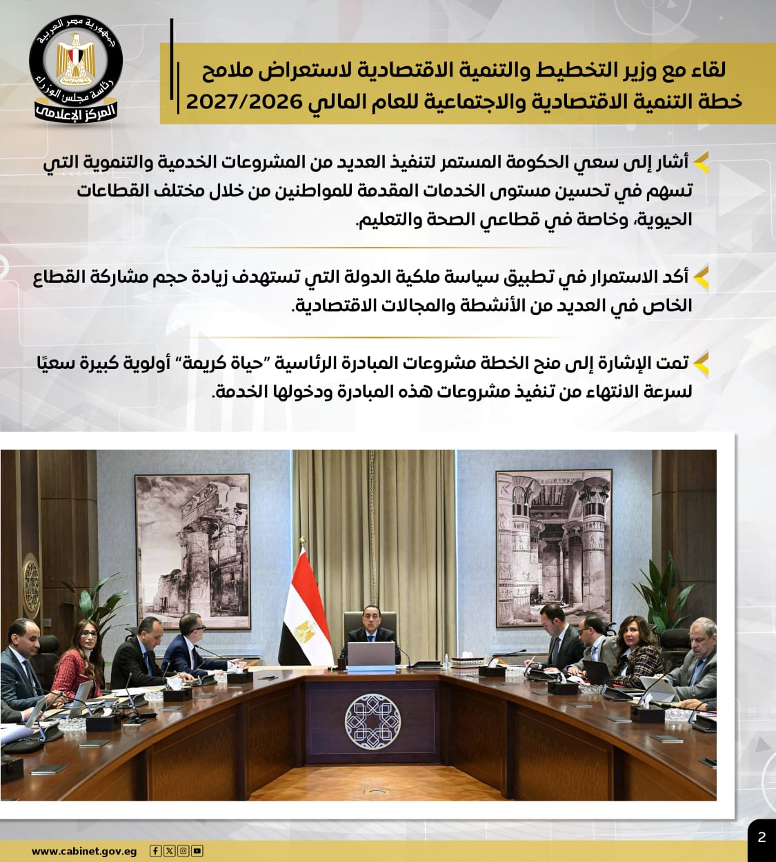 كما التقى مع وزير التخطيط والتنمية الاقتصادية، لاستعراض ملامح خطة التنمية الاقتصادية والاجتماعية للعام المالي 2026/2027، مشيرًا إلى سعى الحكومة المستمر لتنفيذ العديد من المشروعات الخدمية والتنموية التي تسهم في تحسين مستوى الخدمات المقدمة للمواطنين عبر مختلف القطاعات الحيوية، وخاصة في قطاعي الصحة والتعليم.