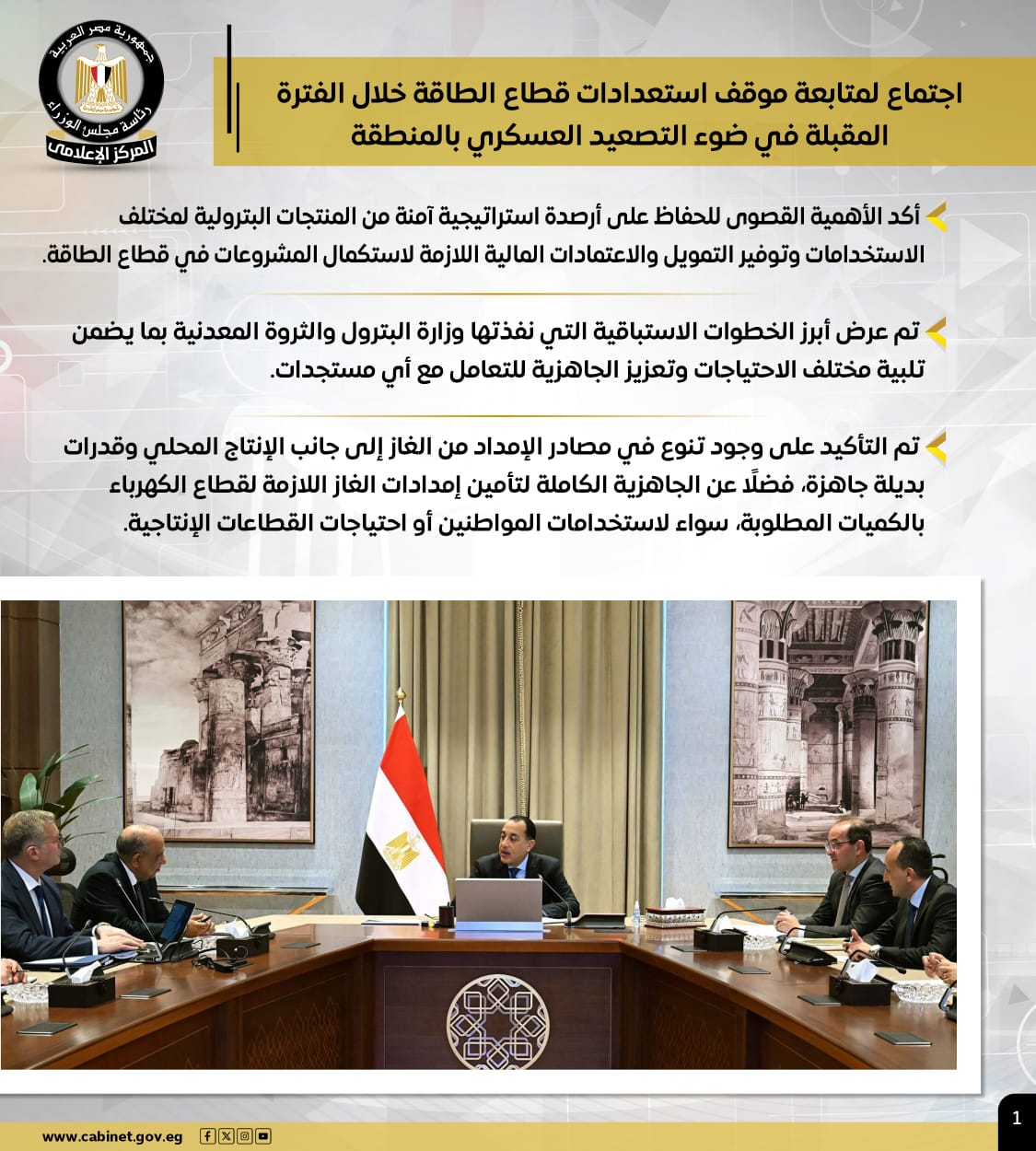 وتضمنت الأنشطة عقد رئيس الوزراء، اجتماعا لمتابعة موقف استعدادات قطاع الطاقة خلال الفترة المقبلة في ضوء التصعيد العسكري بالمنطقة، مؤكدًا الأهمية القصوى للحفاظ على أرصدة استراتيجية آمنة من المنتجات البترولية لمختلف الاستخدامات، وتوفير التمويل والاعتمادات المالية اللازمة لاستكمال المشروعات في قطاع الطاقة.