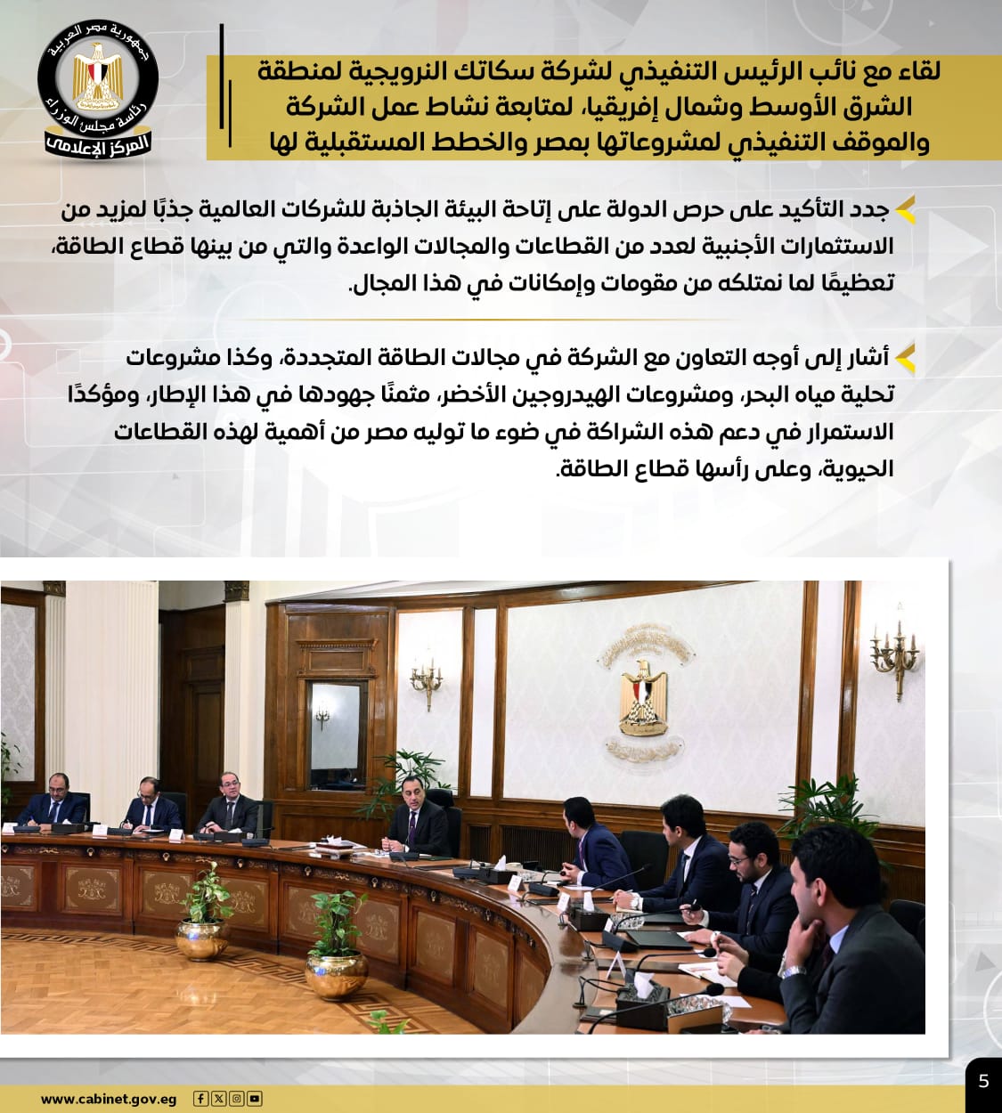 والتقى رئيس الوزراء نائب الرئيس التنفيذي لشركة سكاتك النرويجية لمنطقة الشرق الأوسط وشمال إفريقيا، لمتابعة نشاط عمل الشركة والموقف التنفيذي لمشروعاتها في مصر وخططها المستقبلية، مجددًا التأكيد على حرص الدولة على إتاحة البيئة الجاذبة للشركات العالمية جذبًا لمزيد من الاستثمارات الأجنبية في عدد من القطاعات الواعدة ومن بينها قطاع الطاقة، كما أشار إلى أوجه التعاون مع الشركة في مجالات متعددة.