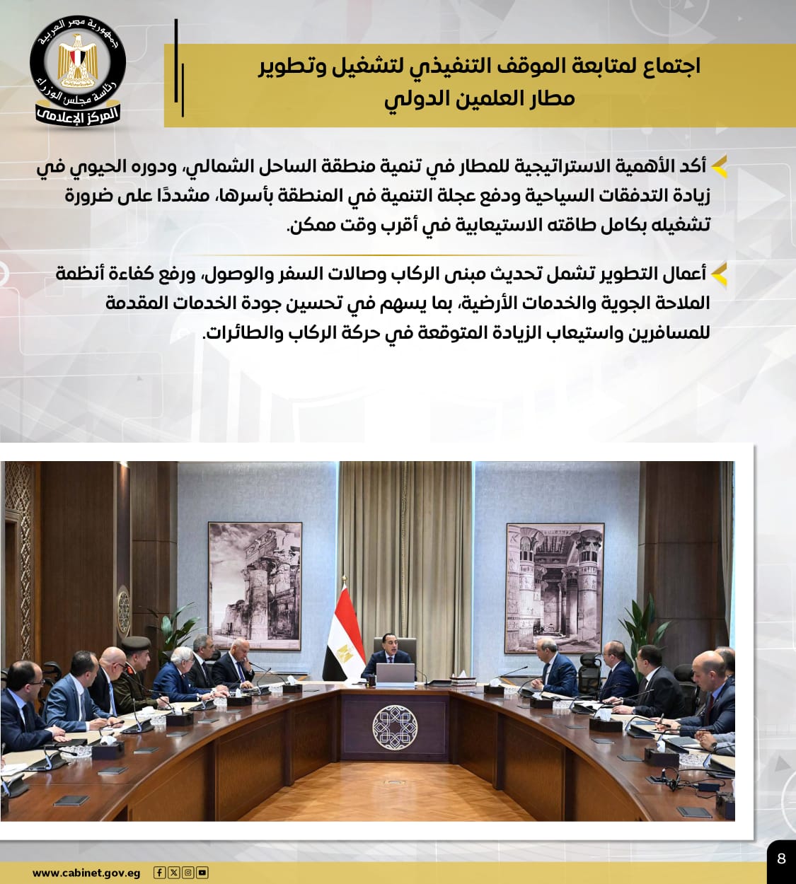 وعقد مدبولي اجتماعًا، لمتابعة الموقف التنفيذي لتشغيل وتطوير مطار العلمين الدولي، حيث أكد الأهمية الاستراتيجية للمطار في تنمية منطقة الساحل الشمالي ودوره الحيوي في زيادة التدفقات السياحية ودفع عجلة التنمية في المنطقة بأسرها، مشددًا على ضرورة تشغيله بكامل طاقته الاستيعابية في أقرب وقت.