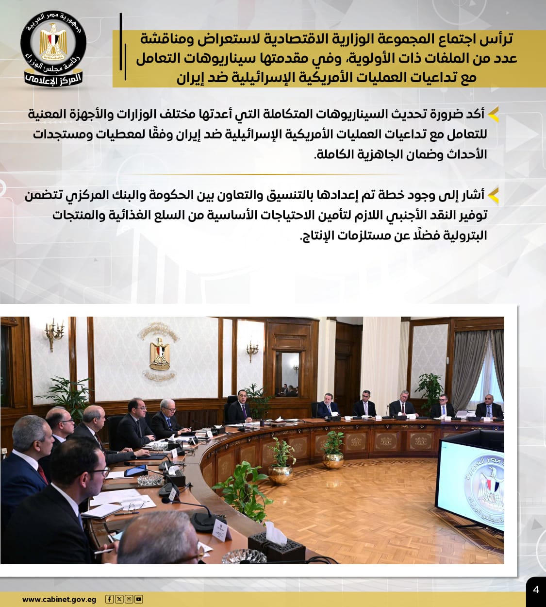 وترأس اجتماع المجموعة الوزارية الاقتصادية، لاستعراض ومناقشة عدد من الملفات ذات الأولوية، وفي مقدمتها سيناريوهات التعامل مع تداعيات العمليات الأمريكية الإسرائيلية ضد إيران، مؤكدًا ضرورة تحديث السيناريوهات المتكاملة التي أعدتها مختلف الوزارات والأجهزة المعنية وفقًا لمعطيات ومستجدات الأحداث، بما يضمن الجاهزية الكاملة، كما أشار إلى وجود خطة تم إعدادها بالتنسيق والتعاون بين الحكومة والبنك المركزي تتضمن توفير النقد الأجنبي اللازم لتأمين الاحتياجات الأساسية من السلع الغذائية والمنتجات البترولية فضلًا عن مستلزمات الإنتاج.