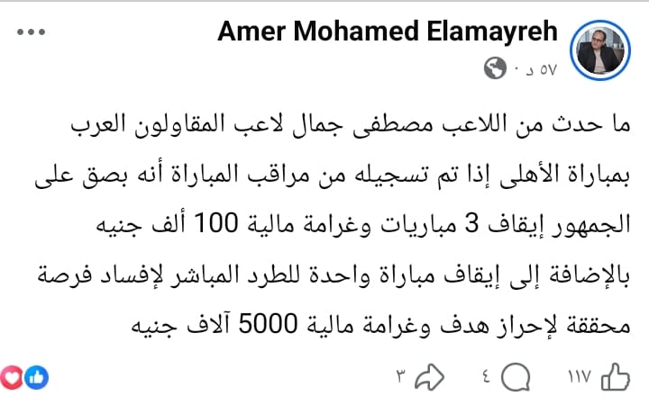 وكتب العمايرة عبر صفحته الرسمية على موقع فيسبوك "أن ما بدر من اللاعب خلال اللقاء، حال إثباته في تقرير مراقب المباراة بقيامه بالبصق على الجماهير، قد يعرضه لعقوبة الإيقاف 3 مباريات مع توقيع غرامة مالية قدرها 100 ألف جنيه.