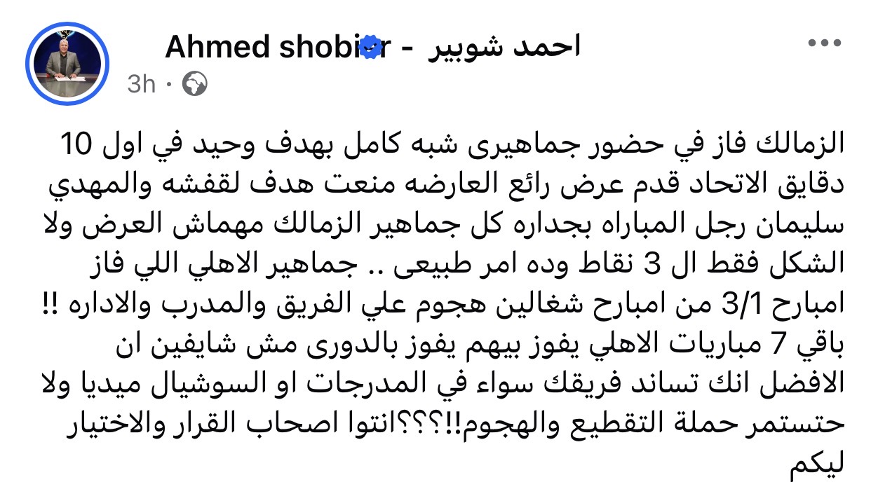 وكتب شوبير عبر حسابه على فيسبوك: "الزمالك فاز في حضور جماهيري شبه كامل بهدف وحيد في أول 10 دقائق، الاتحاد قدم عرضًا رائعًا، والعارضة منعت هدفًا لقفشة، والمهدي سليمان رجل المباراة بجدارة. كل جماهير الزمالك لا يهمها العرض أو الشكل، فقط الثلاث نقاط، وده أمر طبيعي".