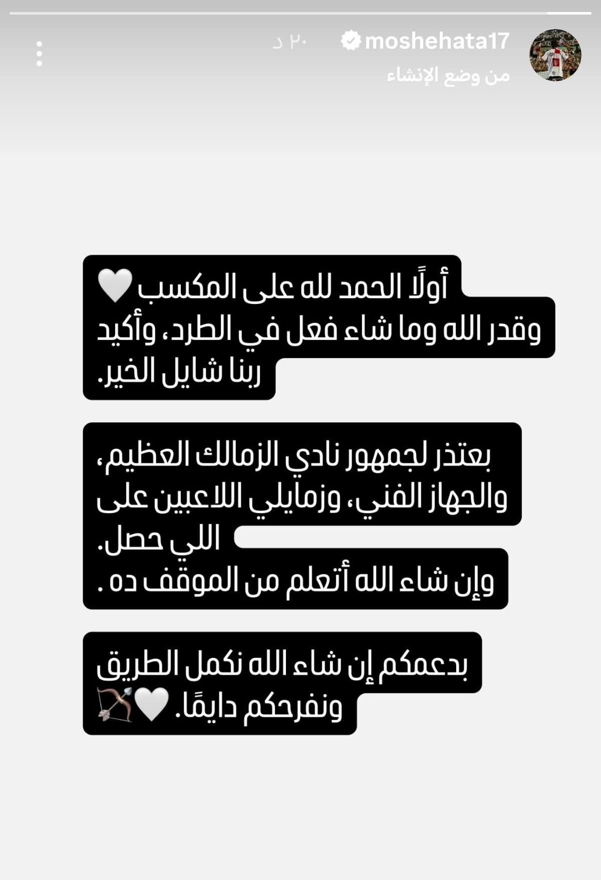 وأضاف لاعب الزمالك:"بعتذر لجمهور نادي الزمالك العظيم، والجهاز الفني، وزمايلي اللاعبين على اللي حصل".