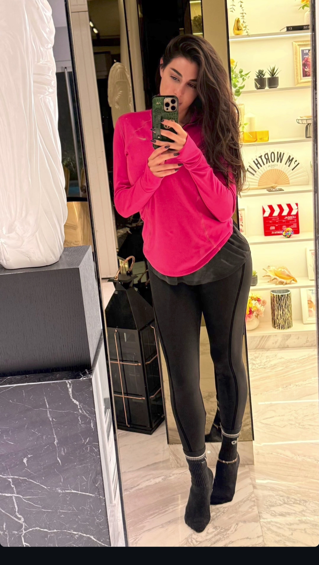 وظهرت ياسمين صبري ، مرتديه بنطال رياضي باللون الأسود، ونسقت معه توب باللون الفوشيا لإكمال ظهورها اللافت.