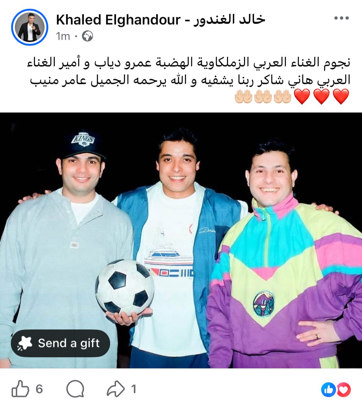 وعلق الغندور على الصورة: "نجوم الغناء العربي الزملكاوية الهضبة عمرو دياب وأمير الغناء العربي هاني شاكر ربنا يشفيه والله يرحمه الجميل عامر منيب".