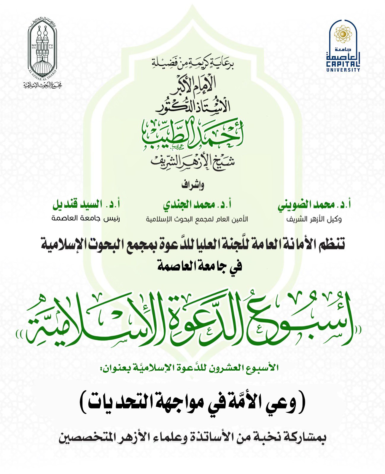 ينظِّم مجمع البحوث الإسلامية بالأزهر الشريف، غدًا الأحد، فعاليَّات الأسبوع العشرين للدَّعوة الإسلاميَّة، الذي تعقده اللجنة العُليا لشئون الدَّعوة في جامعة العاصمة (حلوان سابقًا) تحت عنوان: (وعي الأمَّة في مواجهة التحديات)، وذلك برعايةٍ كريمةٍ من الإمام الأكبر أ.د. أحمد الطيب، شيخ الأزهر الشريف، وبإشراف فضيلة أ.د. محمد الضويني، وكيل الأزهر الشريف، وفضيلة أ.د. محمد الجندي، الأمين العام لمجمع البحوث الإسلاميَّة.