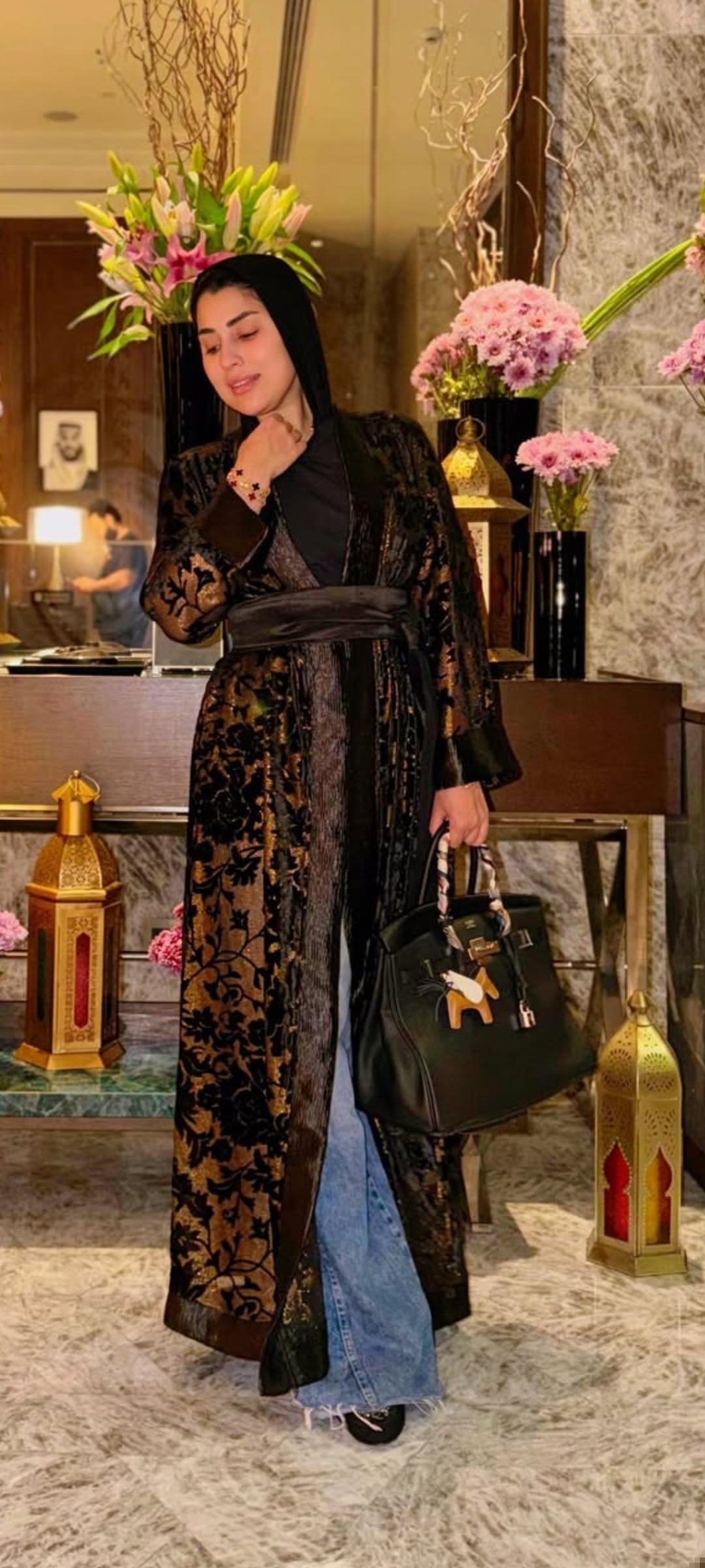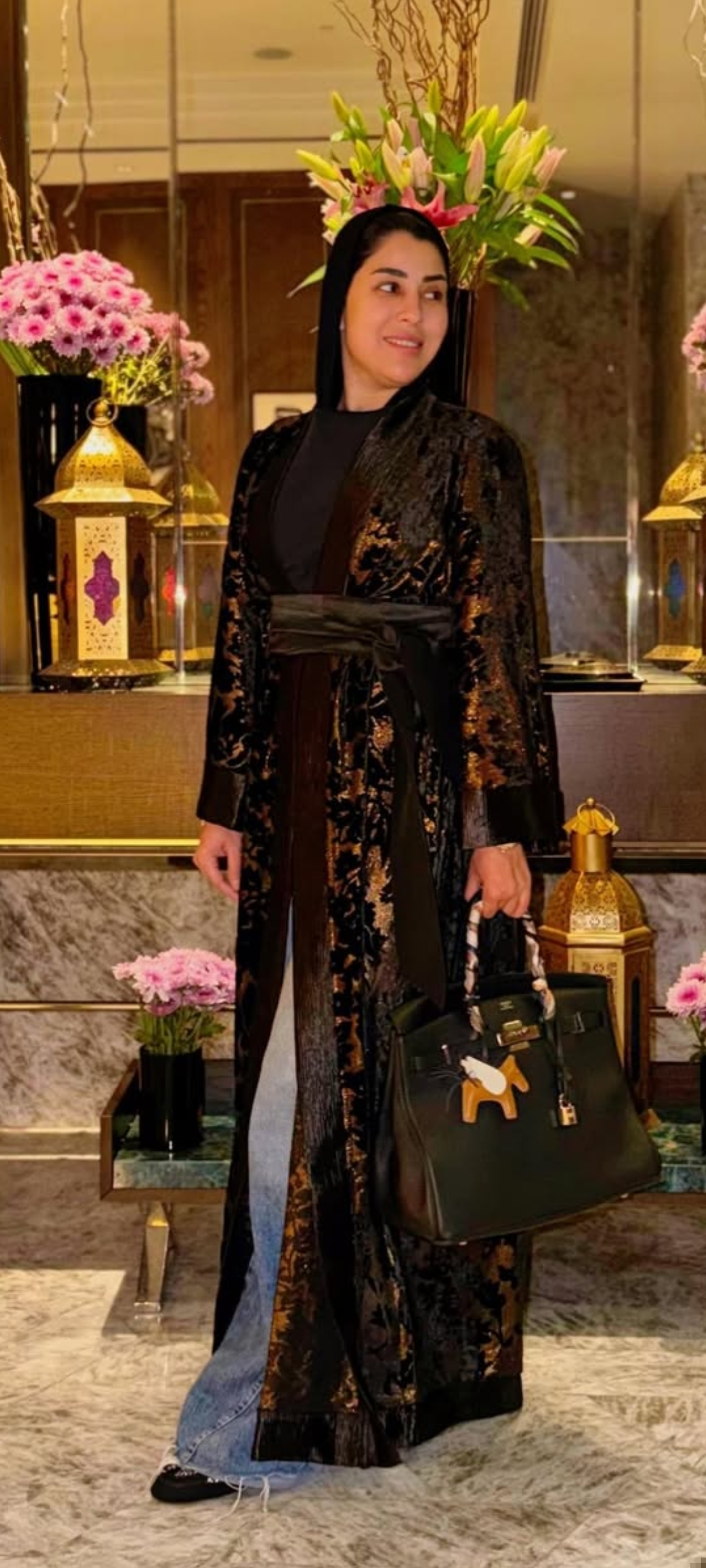 وظهرت آيتن عامر، مرتدية عباءة جذابة باللون الأسود، ووضعت “طرحه” بنفس اللون لإكمال الإطلالة.