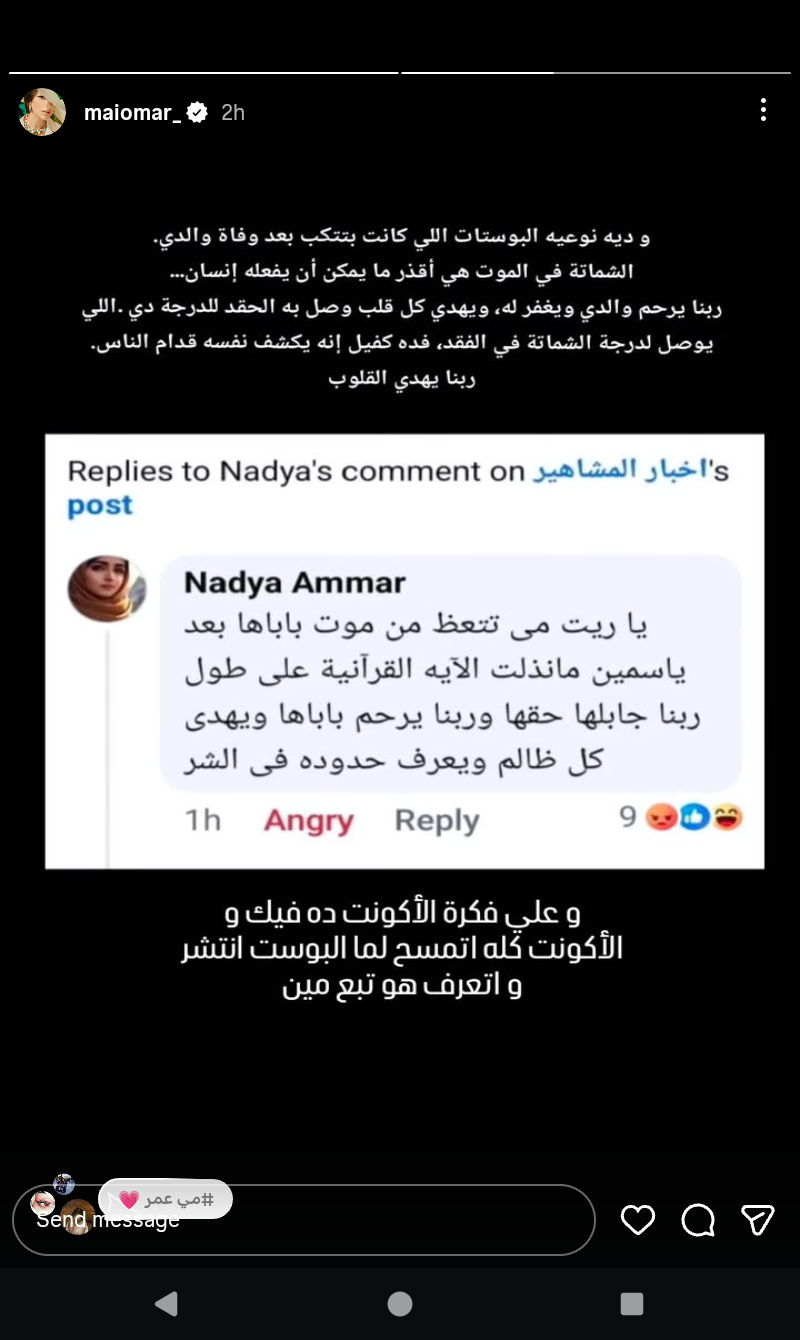 وكتبت مي رداً علي اسكرين شوت بتعليق المتابعة :"ودى نوعية البوستات اللى كانت بتتكتب بعد وفاة والدى، الشماتة فى الموت هى أقذر ما يمكن أن يفعله إنسان، ربنا يرحم والدى ويغفر له، ويهدى كل قلب وصل به الحقد للدرجة دى، اللى يوصل لدرجة الشماتة فى الفقد، فده كفيل إنه يكشف نفسه قدام الناس، ربنا يهدى القلوب".