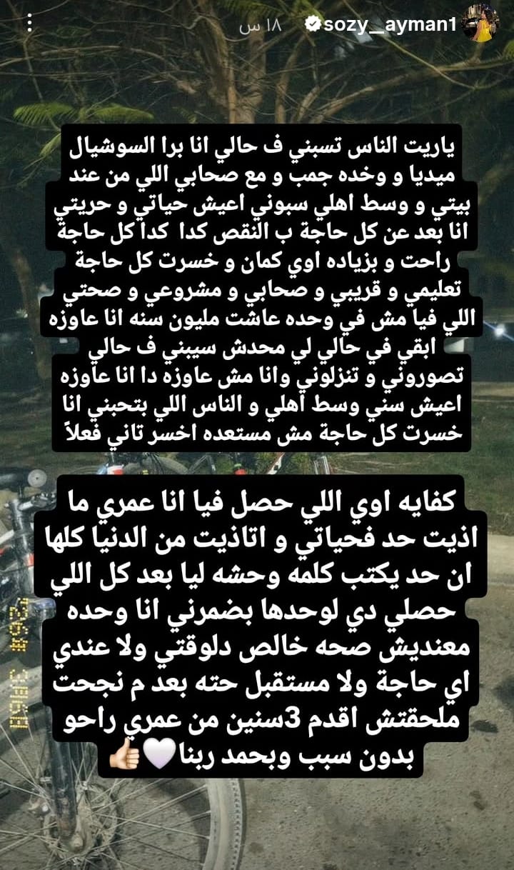 واختتمت رسالتها" انا بمر بظروف صعبة حاليًا، مطالبة الجميع بعدم تداول صورها أو نشرها عبر مواقع التواصل، لأنها ترغب في استعادة حياتها بعيدًا عن الضغوط.