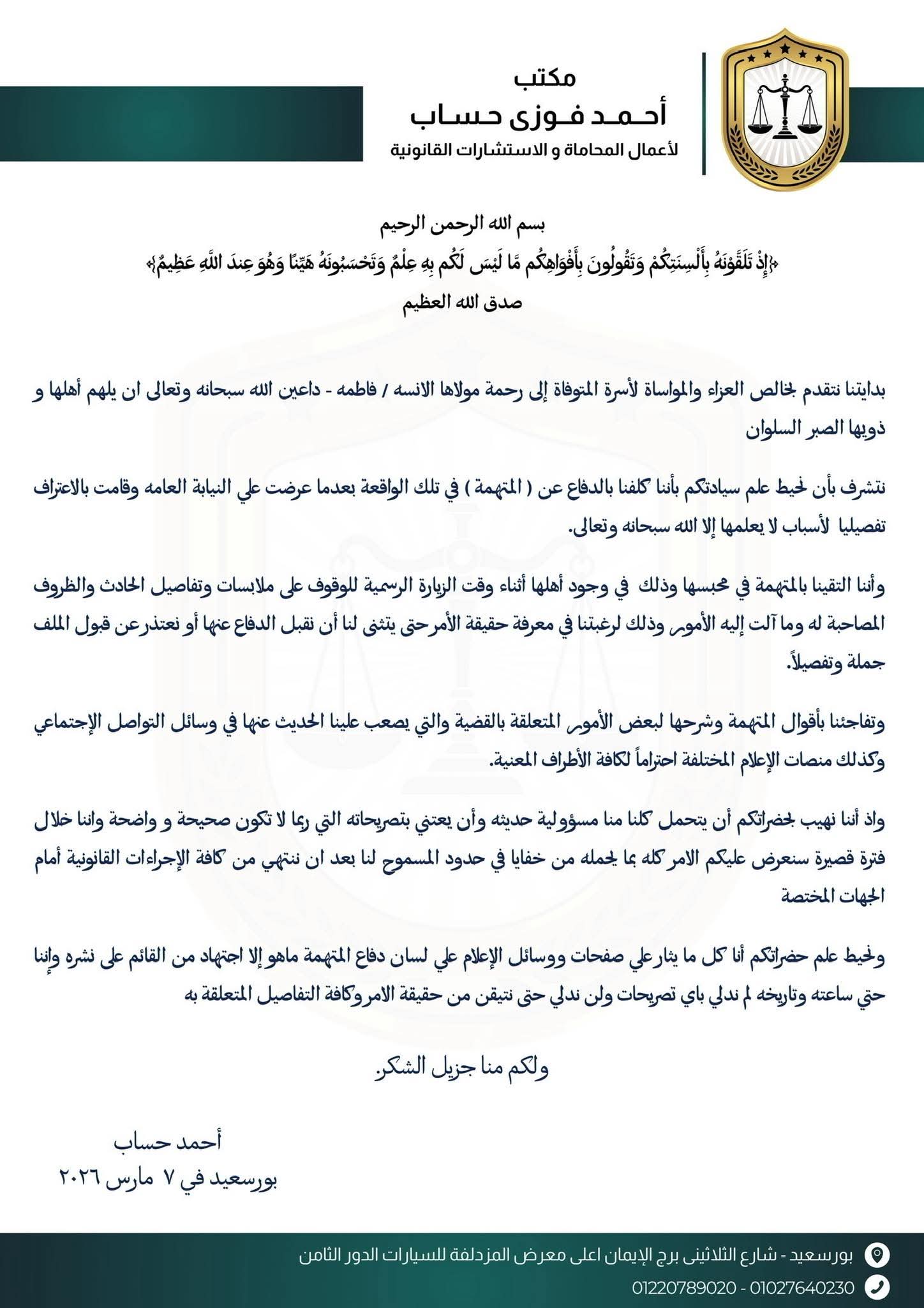 ولفت المحامى أحمد حساب باصداره بيان رسمي بخصوص الواقعة وما اقرته موكلته من أقوال جديدة