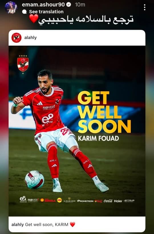 وكتب إمام عاشور عبر حسابه على إنستجرام: "ترجع بالسلامة يا حبيبي".
