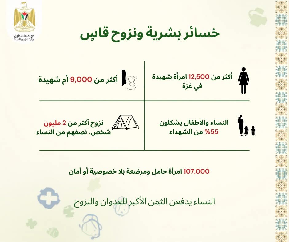 وأكدت وزيرة شؤون المرأة منى الخليلي، أن الحق في الصحة يمثل ركيزة أساسية لصمود المرأة الفلسطينية وتمكينها، مشيرة إلى أن الأرقام الواردة في التقرير تعكس حجم الاستهداف الذي تتعرض له النساء، خاصة الحوامل والمرضعات وذوات الإعاقة، في ظل القيود المفروضة على الوصول إلى الخدمات الطبية.