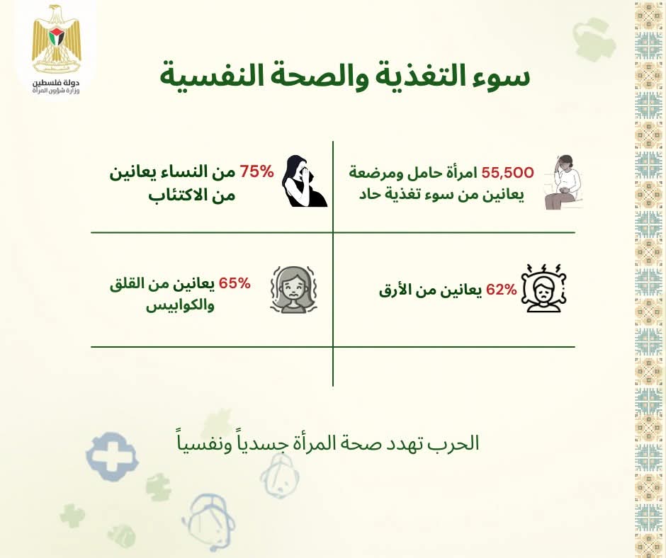 كما أشار التقرير إلى معاناة 55,500 امرأة حامل ومرضعة من سوء التغذية الحاد، إضافة إلى انتشار واسع لمشكلات الصحة النفسية، حيث تعاني 75% من النساء من الاكتئاب، و62% من الأرق، و65% من القلق المستمر.