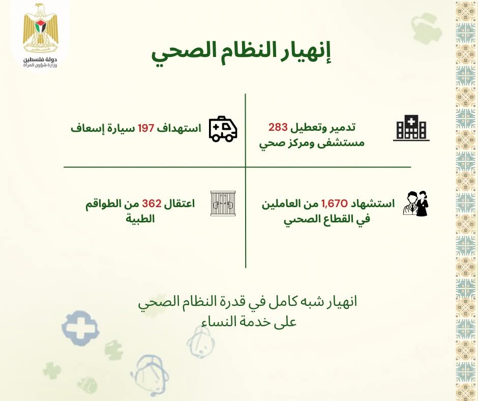 ووفق التقرير، تعرضت 283 مستشفى ومركزاً صحياً للتدمير أو التعطيل، كما جرى استهداف 197 سيارة إسعاف، واستشهد 1670 من العاملين في القطاع الصحي، إضافة إلى اعتقال 362 آخرين، ما أدى إلى شلل واسع في القدرة على تقديم الخدمات الصحية الأساسية، خصوصاً في مجالات الصحة الإنجابية ورعاية الحوامل.