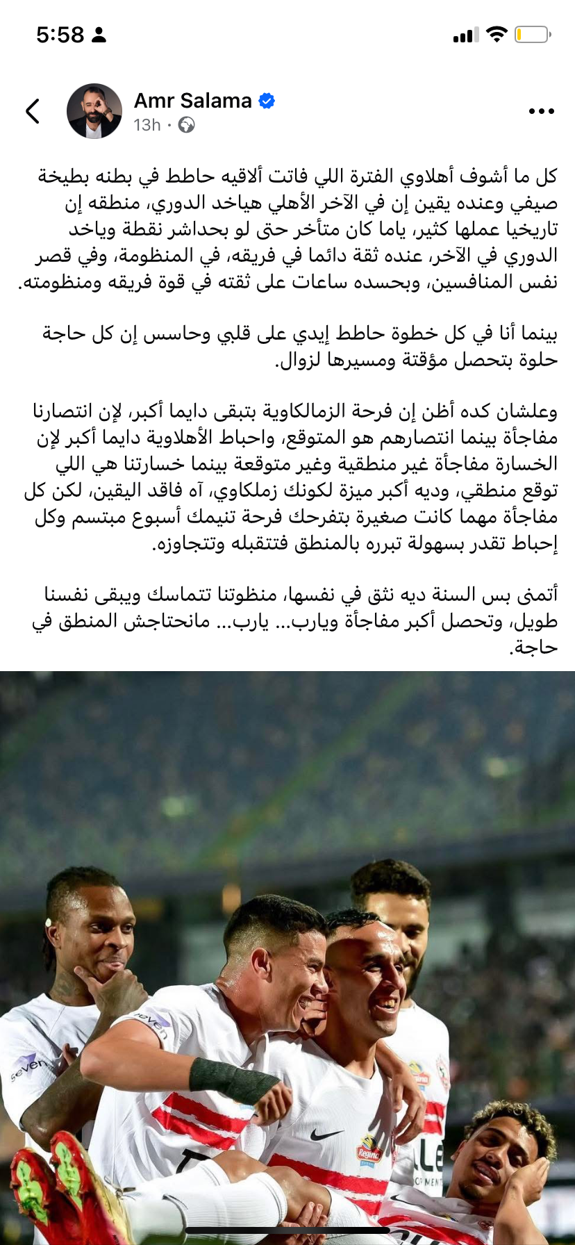 وقال عمرو سلامة عبر حسابه بموقع التواصل الإجتماعي فيسبوك:"كل ما أشوف أهلاوي الفترة اللي فاتت ألاقيه حاطط في بطنه بطيخة صيفي وعنده يقين إن في الآخر الأهلي هياخد الدوري، منطقه إن تاريخيا عملها كثير، ياما كان متأخر حتى لو بحداشر نقطة وياخد الدوري في الآخر، عنده ثقة دائما في فريقه، في المنظومة، وفي قصر نفس المنافسين، وبحسده ساعات على ثقته في قوة فريقه ومنظومته".