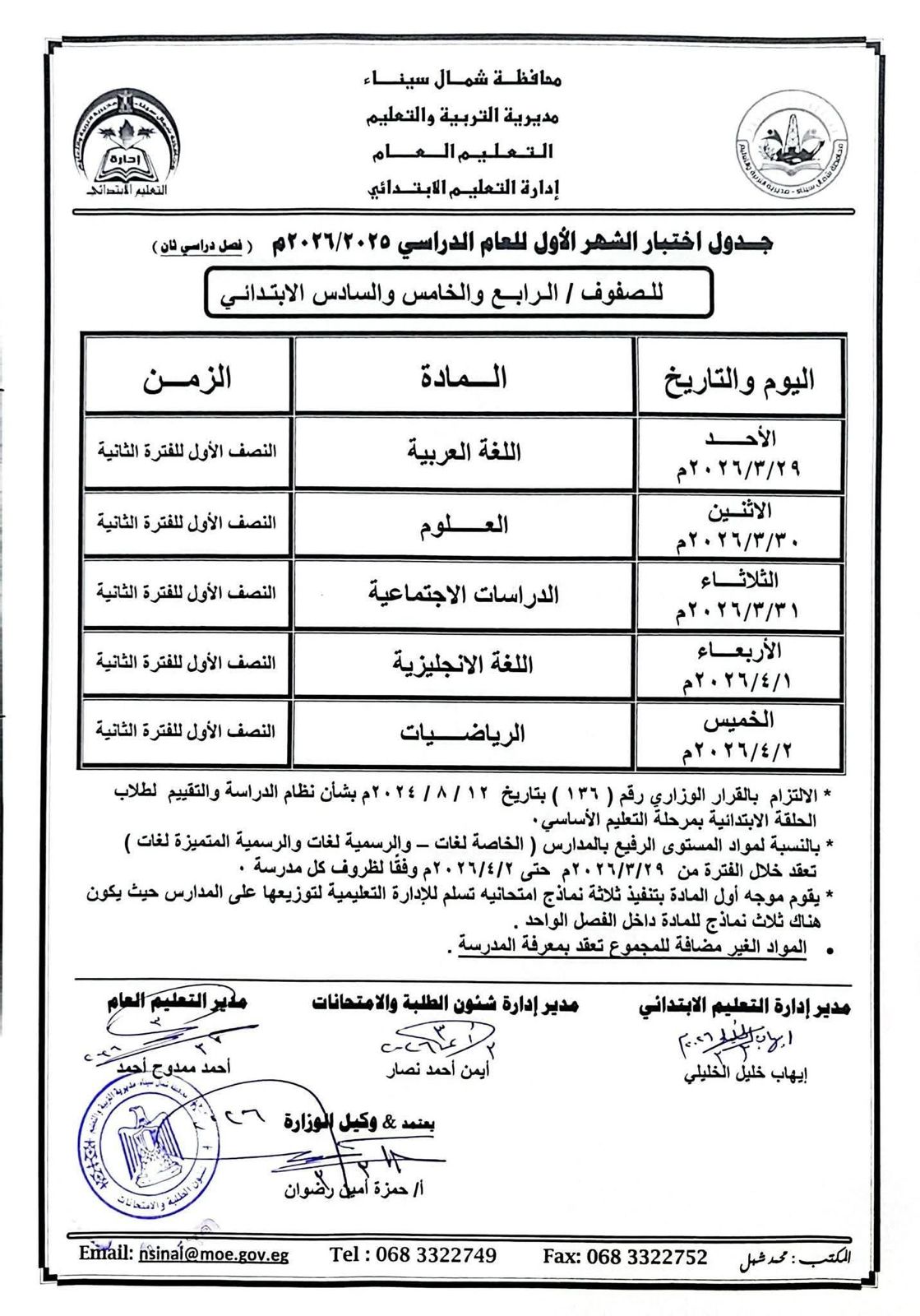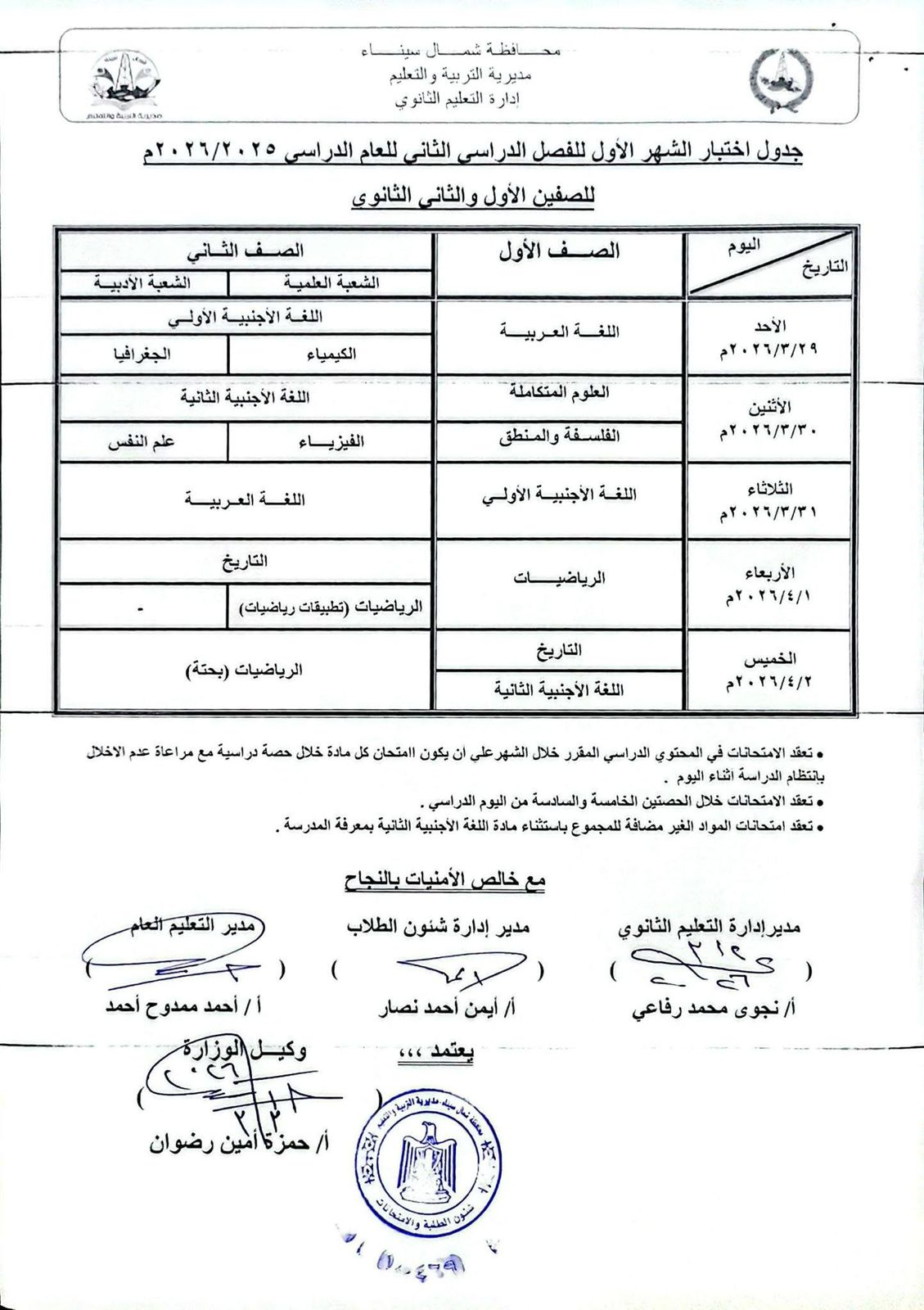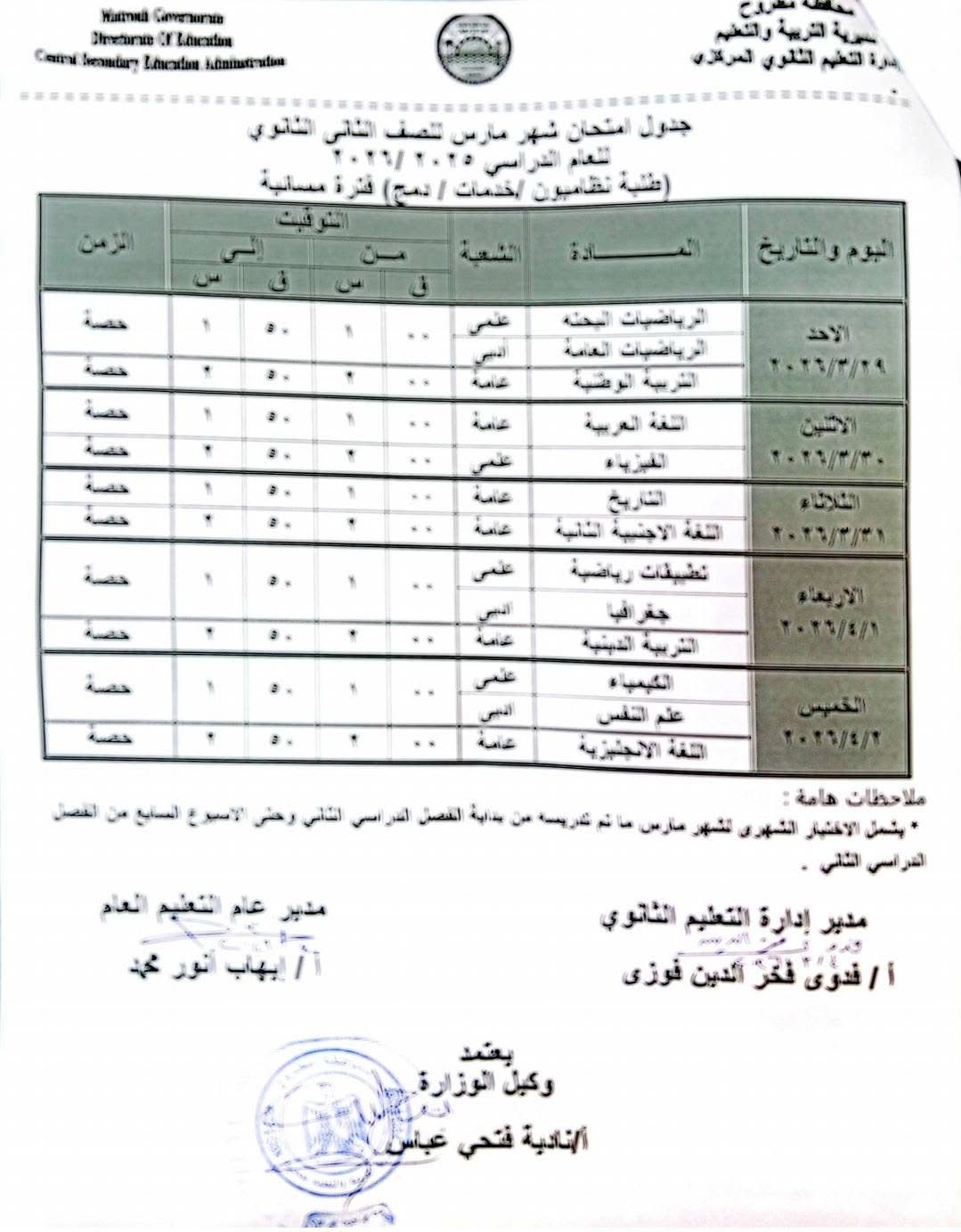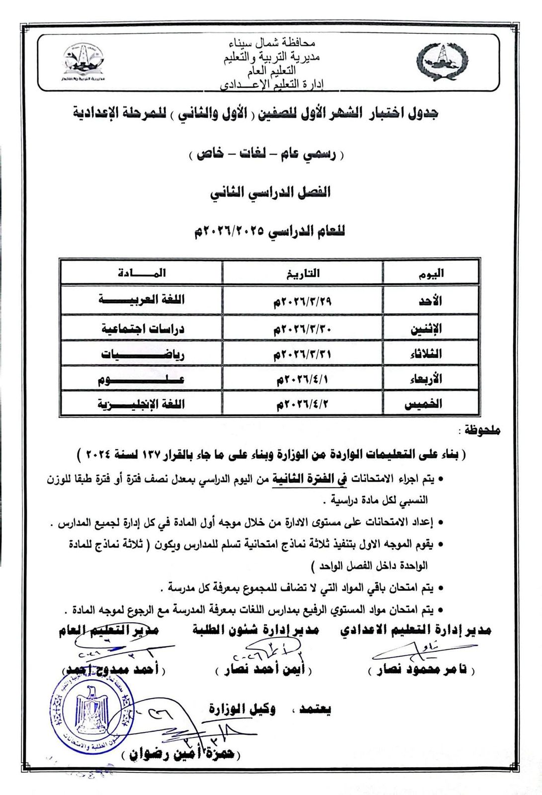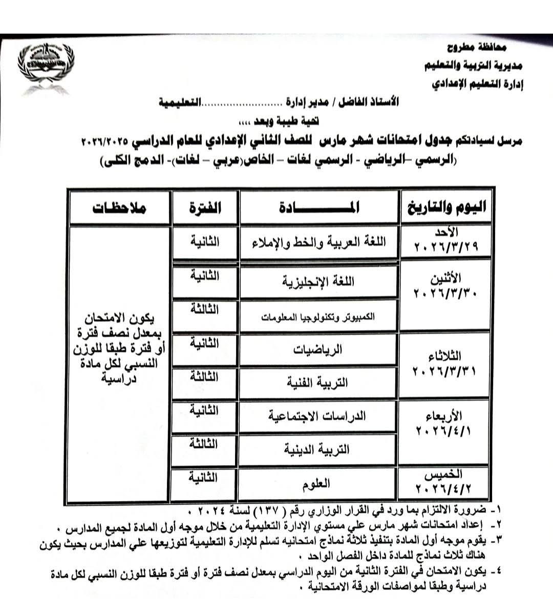- يقوم مديري الإدارات التعليمية بإتخاذ ما يلزم من إجراءات لضمان سرية امتحانات شهر مارس 2026