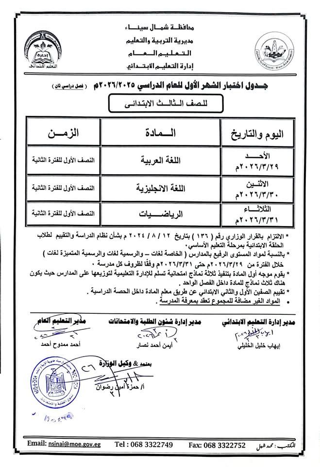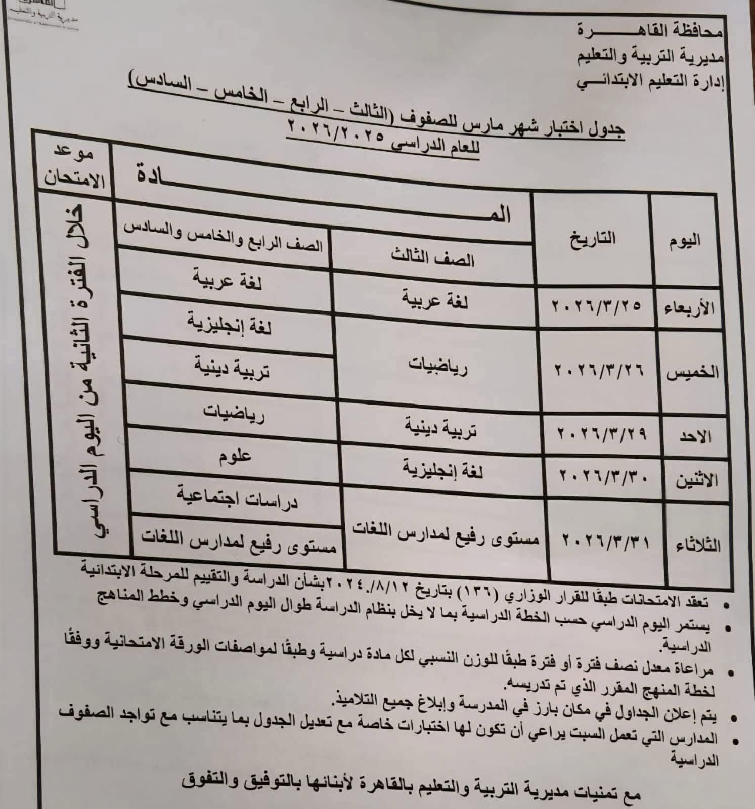 - يتم اداء امتحانات شهر مارس 2026 خلال اليوم الدراسي ويتم استكمال باقي اليوم الدراس بشكل طبيعي وفقا لجدول المدرسة