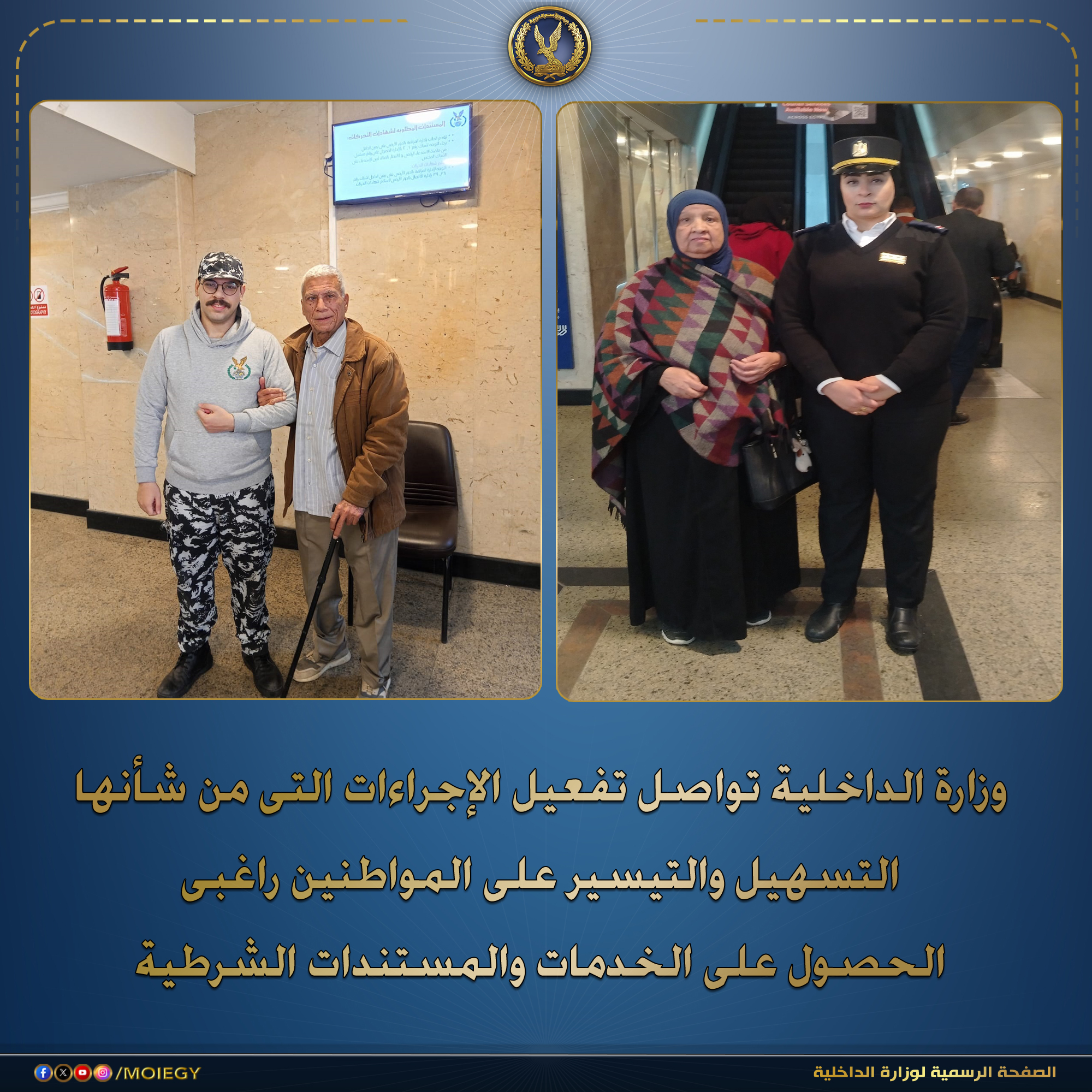 فى إطار سياسة وزارة الداخلية الهادفة إلى مراعاة حقوق الإنسان والتيسير على المواطنين راغبى الحصول على الخدمات والمستندات الشرطية وخاصةً كبار السن وذوى الإحتياجات الخاصة.