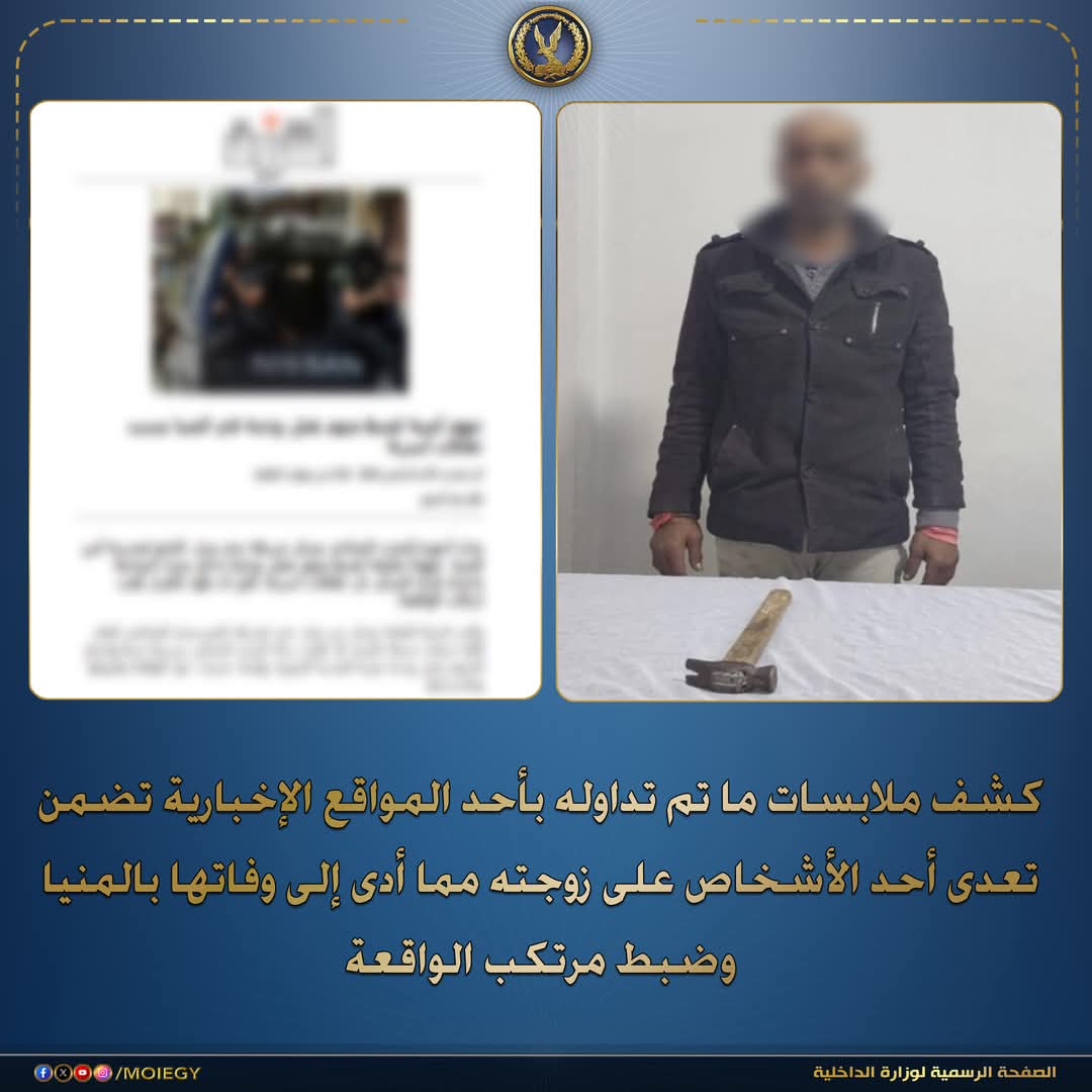 كانت الأجهزة الأمنية، قد تلقت إخطار بالعثور على جثة ربة منزل بمدينة بني مزار، وبالفحص تبين أنه بتاريخ 7 مارس الجارى تبلغ لمركز شرطة بنى مزار بقيام (بائع أسماك "له معلومات جنائية") بالتعدى بالضرب على زوجته (ربة منزل) مقيمان بدائرة المركز مما أدى إلى وفاتها داخل منزلها.