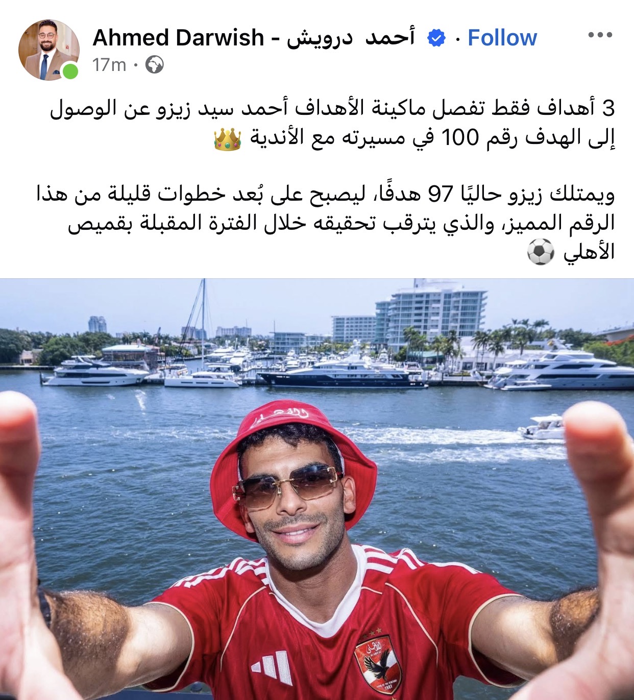 وكتب درويش عبر حسابه الشخصي بموقع فيسبوك: "3 أهداف فقط تفصل ماكينة الأهداف أحمد سيد زيزو عن الوصول إلى الهدف رقم 100 في مسيرته مع الأندية