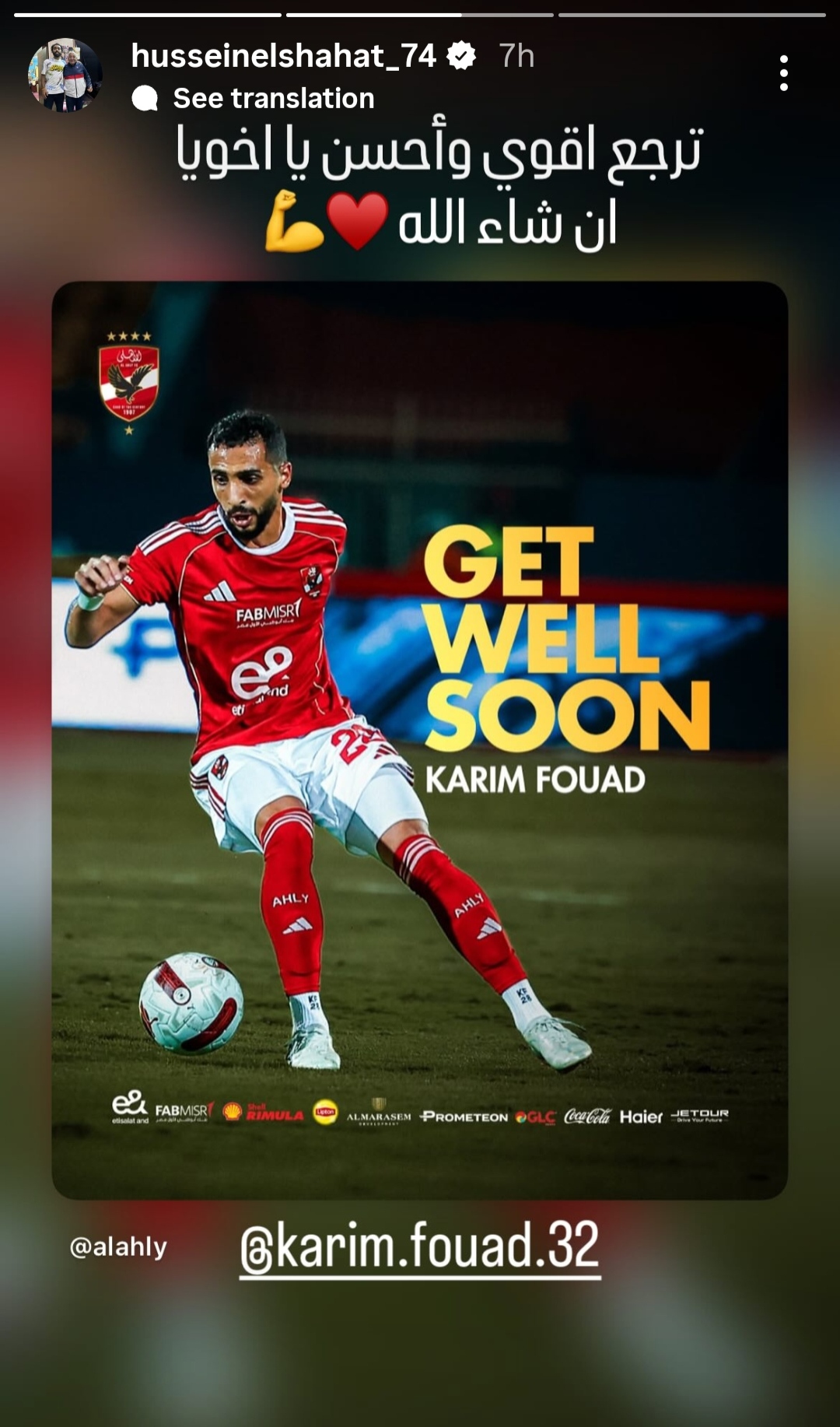 وكتب حسين الشحات عبر حسابه على موقع التواصل الاجتماعي إنستجرام: "ترجع أقوي وأحسن يا أخويا إن شاء الله .