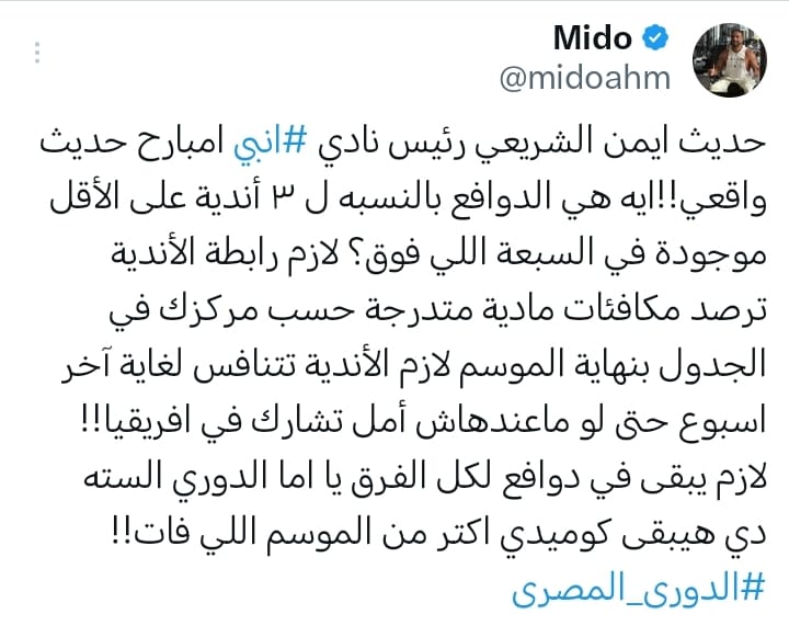وقال ميدو عبر حسابه الرسمي على موقع إكس: “حديث أيمن الشريعي رئيس نادي إنبي أمس حديث واقعي! ما هي الدوافع بالنسبة لثلاثة أندية على الأقل من ضمن السبعة الأوائل في الجدول؟”.