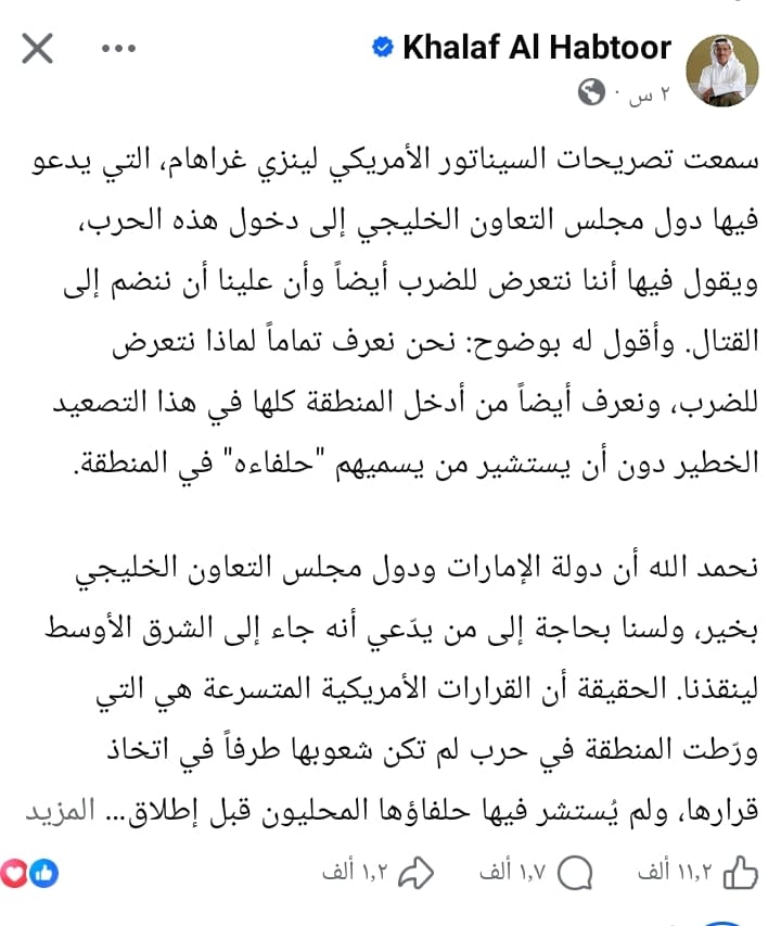 انتقد رجل الأعمال الإماراتي خلف الحبتور تصريحات السيناتور الأمريكي لينزي جراهام التي دعا فيها دول مجلس التعاون الخليجي إلى الانضمام إلى الحرب الجارية في المنطقة، مؤكدًا أن شعوب المنطقة ليست طرفًا في هذه الصراعات ولن تضحي بأبنائها لخدمة مصالح الآخرين.