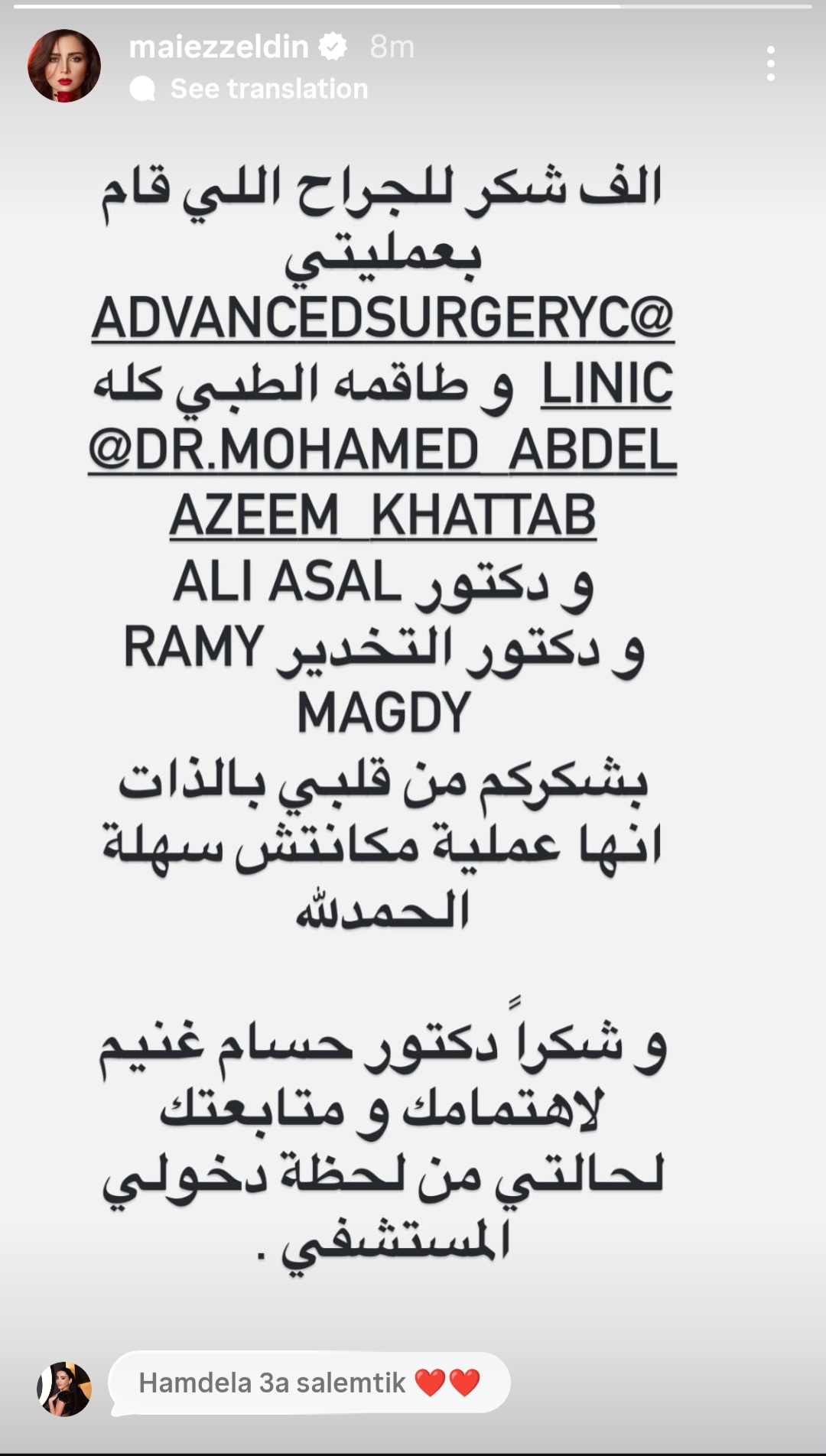 و كتبت مي عز الدين عبر خاصية الاستوري :الف شكر للجراح اللي قام بعمليتي و طاقمه الطبي كله و دكتور التخدير ،بشكركم من قلبي بالذات انها عملية مكانتش سهلة الحمد لله.
