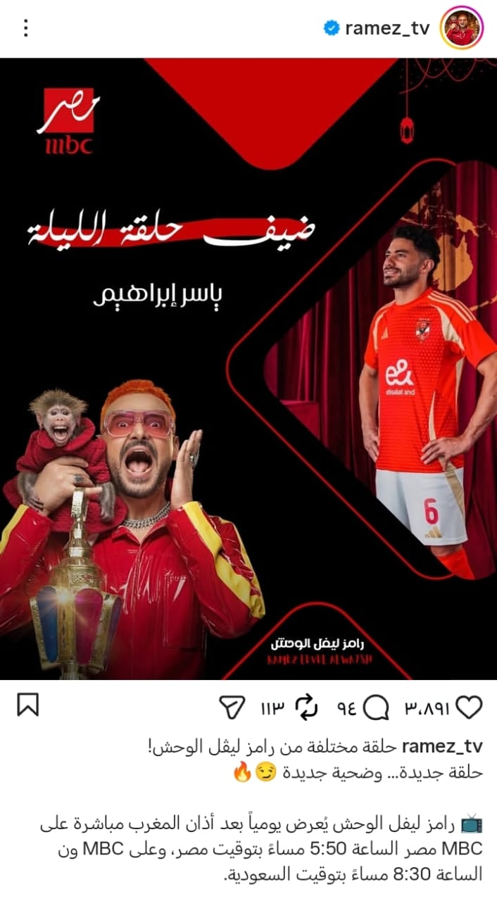 يحل ياسر إبراهيم نجم النادي الأهلي ومنتخب مصر ضيفًا بحلقة اليوم من برنامج «رامز ليفل الوحش»، حيث من المتوقع أن تشهد الحلقة العديد من المواقف الساخرة والمقالب الكوميدية التي تثير إعجاب الجمهور.