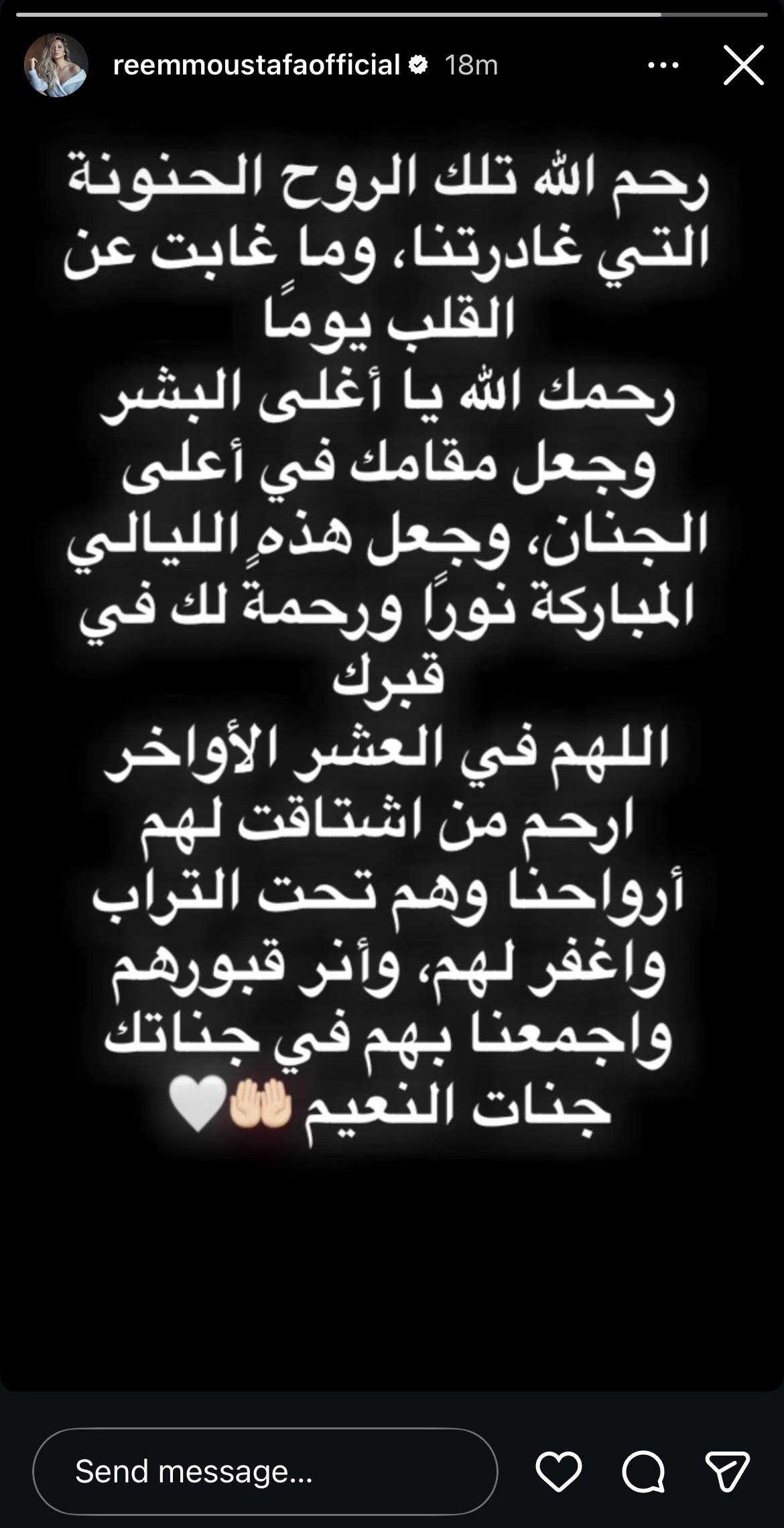 وتابعت: “اللهم في العشر الأواخر ارحم من اشتاقت لهم ارواحنا وهم تحت التراب واغفر لهم”.