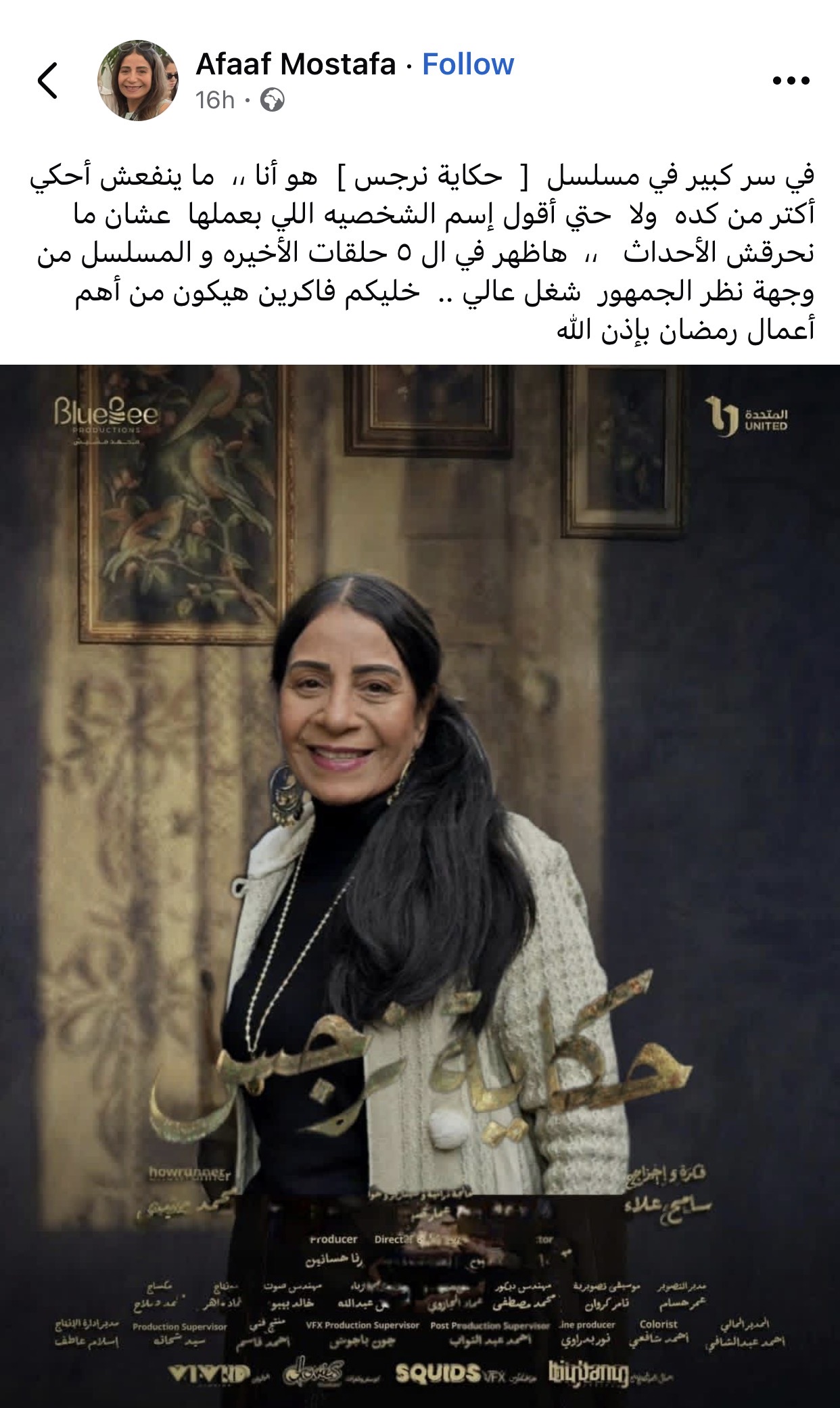 وكتبت عفاف مصطفى عبر حسابها الشخصي بموقع فيسبوك: “في سر كبير في مسلسل حكاية نرجس هو أنا ما ينفعش أحكي أكتر من كده ولا حتي أقول إسم الشخصيه اللي بعملها عشان ما نحرقش الأحداث”.