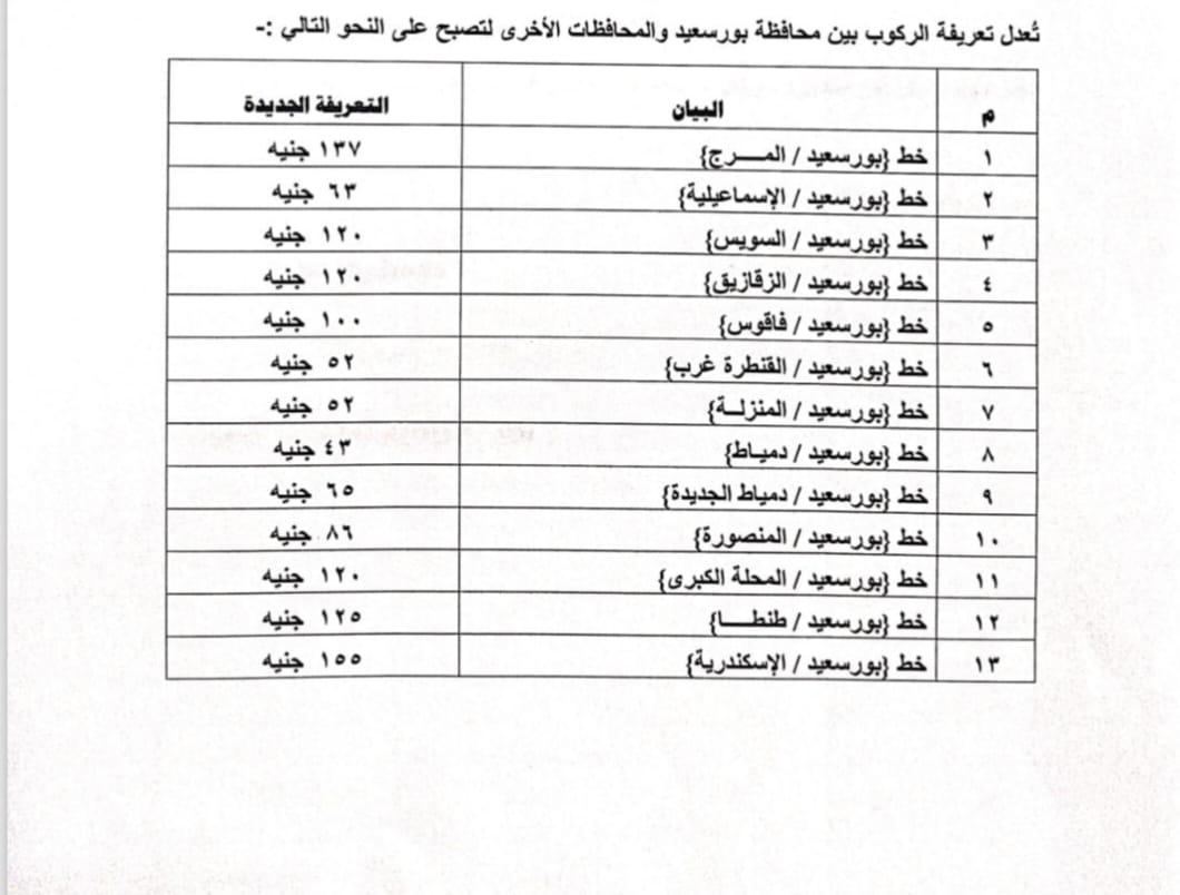 اعتمد اللواء إبراهيم أبو ليمون محافظ بورسعيد، زيادة تعريفة الأجرة على جميع المواصلات العامة بالخطوط الداخلية والخارجية بنطاق المحافظة، عقب قرار زيادة أسعار السولار والبنزين.