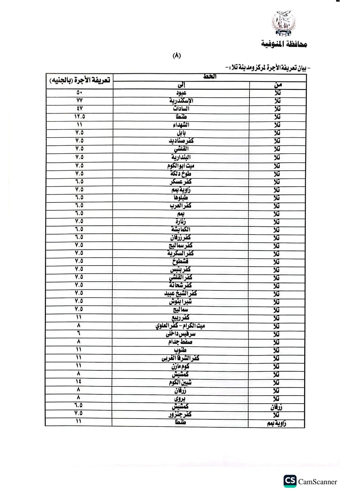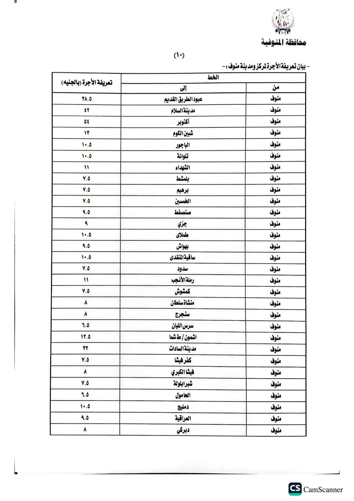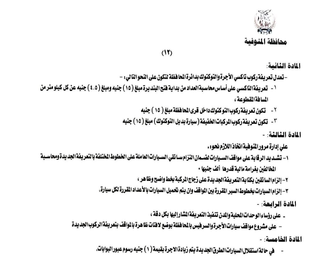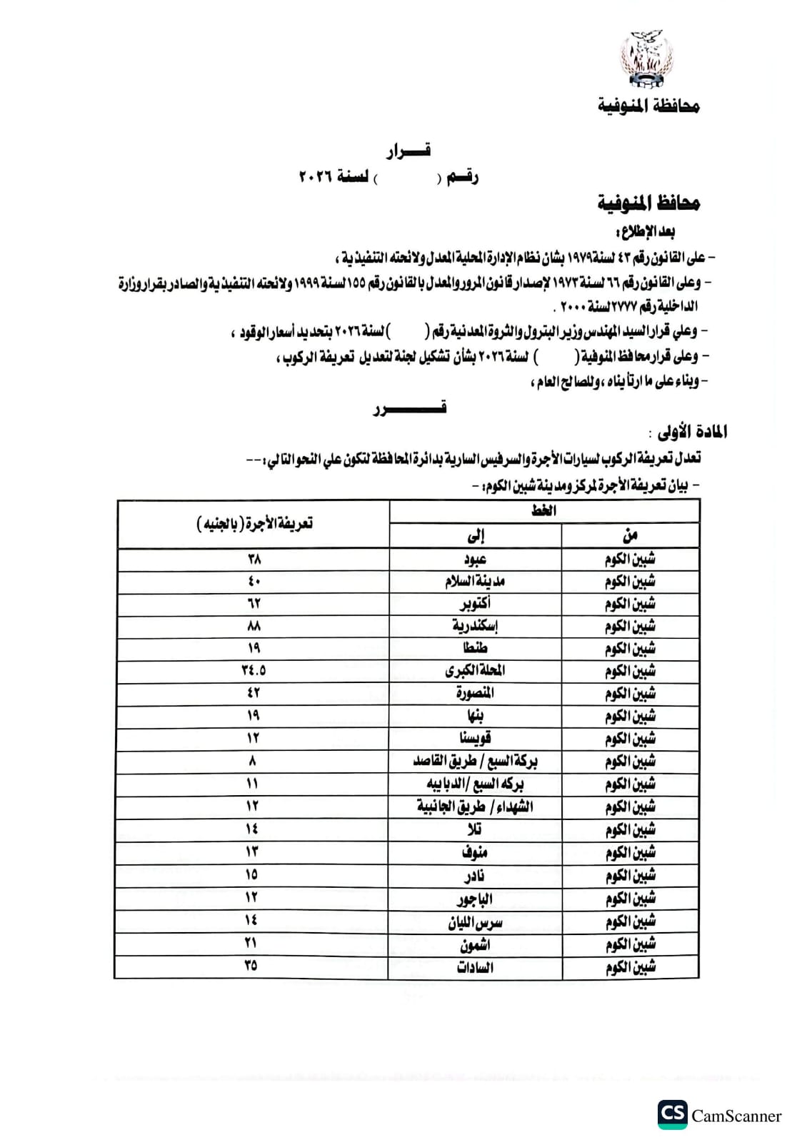 أصدر اليوم اللواء عمرو الغريب محافظ المنوفية قرارا بشأن تعديل التعريفة الجديدة والمقررة لركوب سيارات الأجرة والسرفيس والتاكسي والتوك توك بدائرة المحافظة ، وذلك عقب قرار لجنة التسعير التلقائي للمنتجات البترولية وزيادة أسعار البنزين والسولار اعتبارا من اليوم الثلاثاء الموافق ١٠ مارس٢٠٢٦.