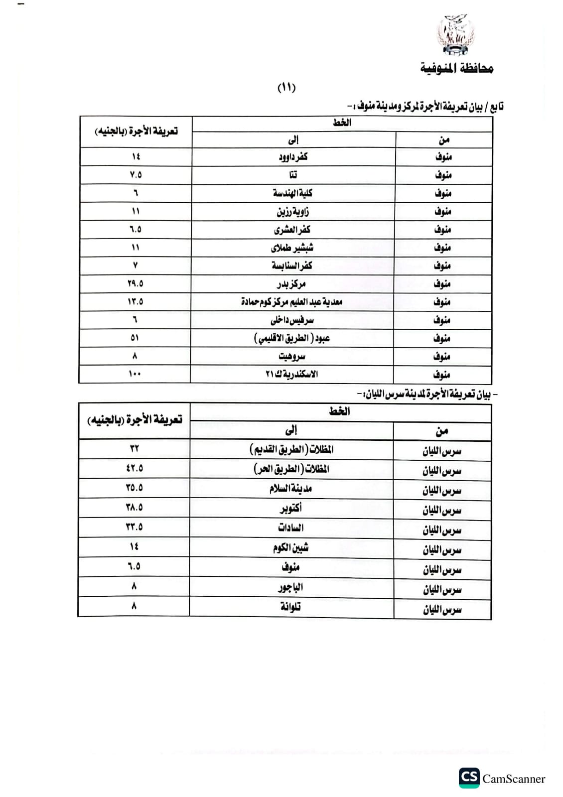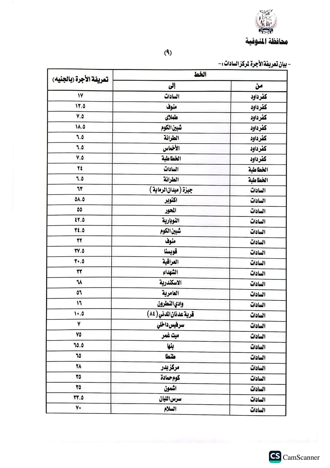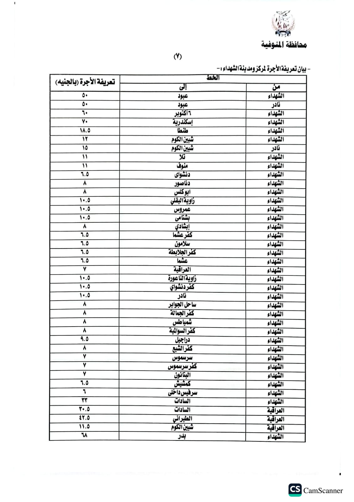 أصدر اليوم اللواء عمرو الغريب محافظ المنوفية قرارا بشأن تعديل التعريفة الجديدة والمقررة لركوب سيارات الأجرة والسرفيس والتاكسي والتوك توك بدائرة المحافظة ، وذلك عقب قرار لجنة التسعير التلقائي للمنتجات البترولية وزيادة أسعار البنزين والسولار اعتبارا من اليوم الثلاثاء الموافق ١٠ مارس٢٠٢٦.