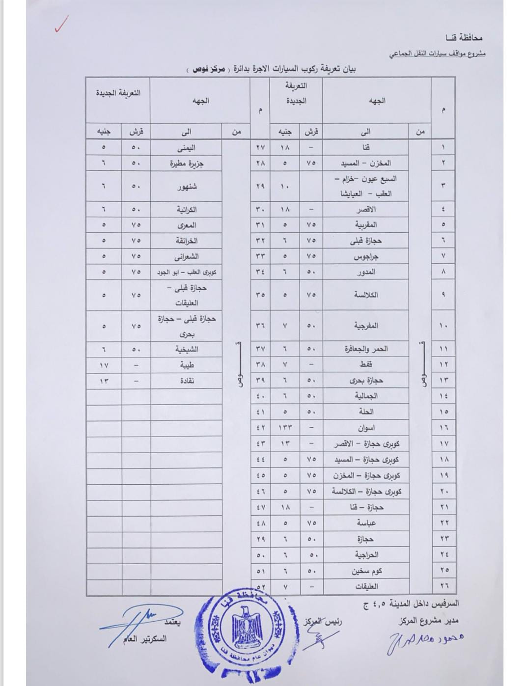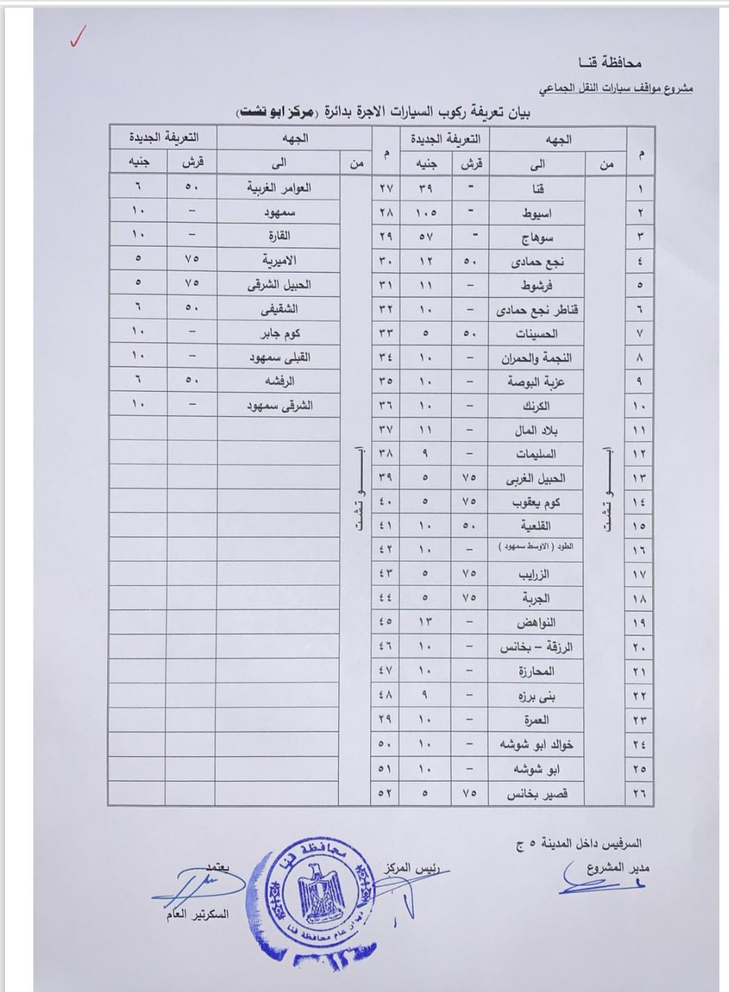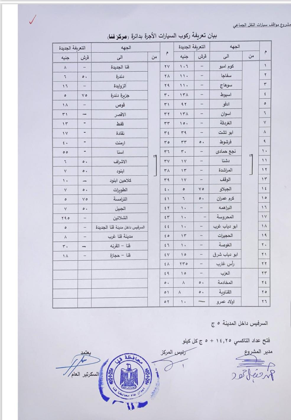 اعتمد اللواء دكتور مصطفى الببلاوي، محافظ قنا، تعريفة الركوب الجديدة للمواصلات العامة والخطوط الداخلية والخارجية بنطاق المحافظة، وتشمل سيارات الميكروباص والسرفيس وسيارات التاكسي، وذلك عقب تحريك سعر المواد البترولية بمعرفة لجنة التسعير التلقائي للمواد البترولية.