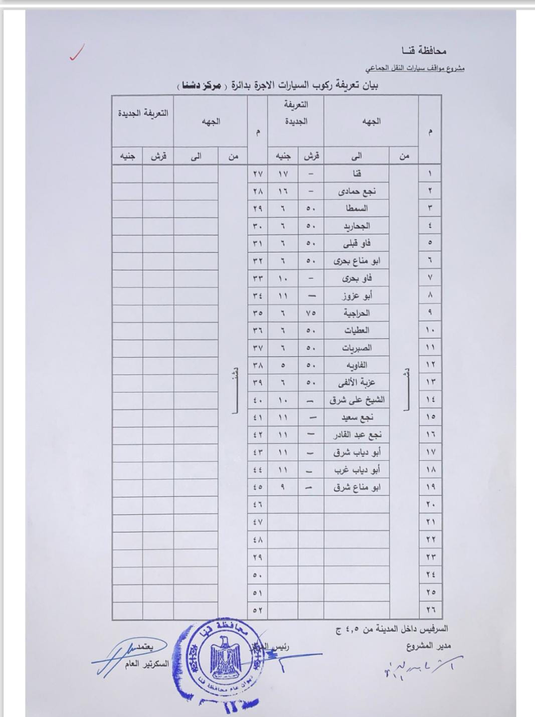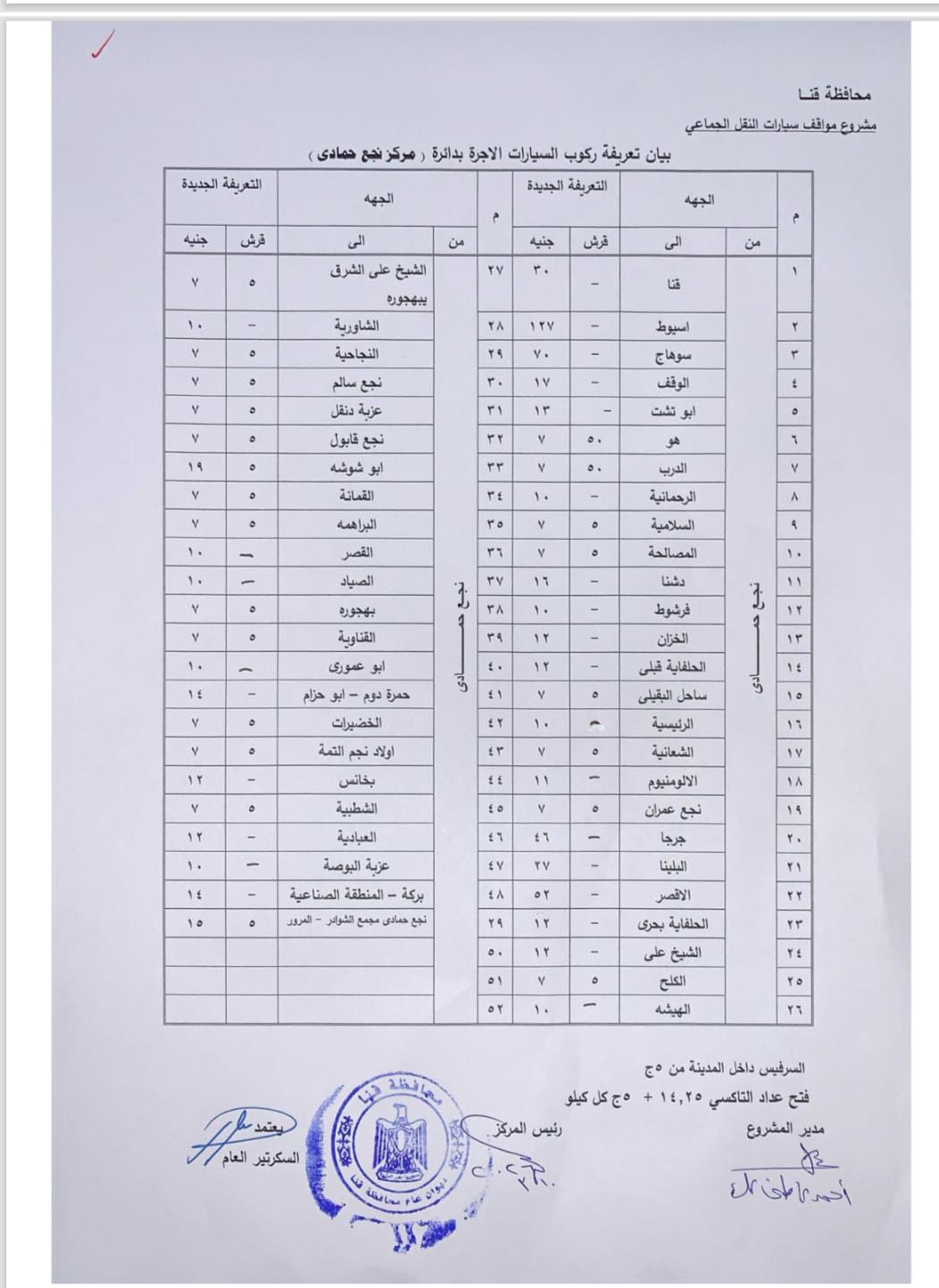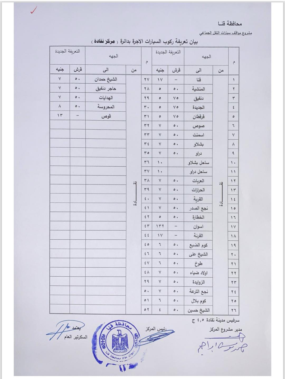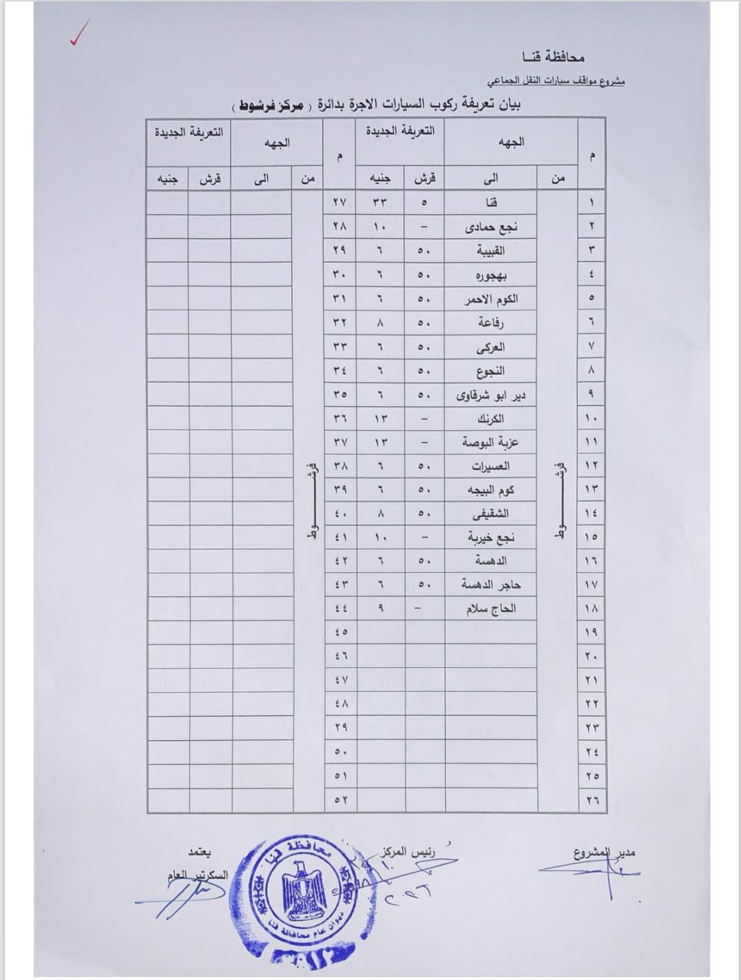 اعتمد اللواء دكتور مصطفى الببلاوي، محافظ قنا، تعريفة الركوب الجديدة للمواصلات العامة والخطوط الداخلية والخارجية بنطاق المحافظة، وتشمل سيارات الميكروباص والسرفيس وسيارات التاكسي، وذلك عقب تحريك سعر المواد البترولية بمعرفة لجنة التسعير التلقائي للمواد البترولية.