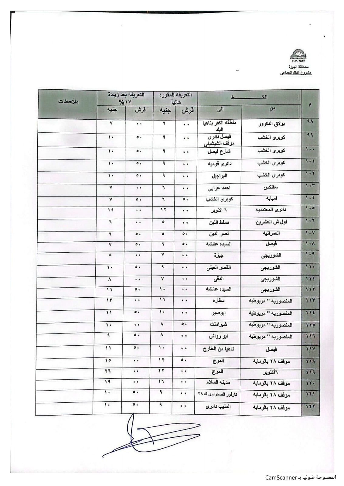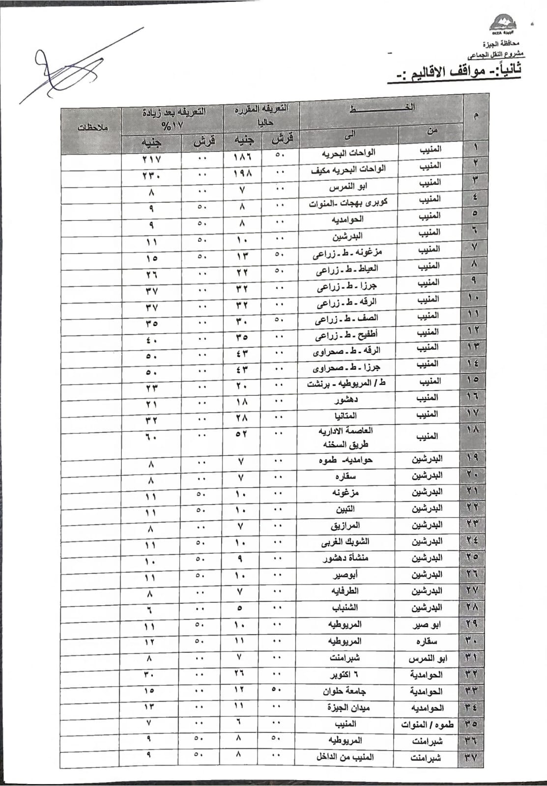 اعتمد الدكتور أحمد الأنصاري محافظ الجيزة التعريفة الجديدة لسيارات السرفيس والنقل الجماعي الداخلية والخارجية والتي يتم تطبيقها اعتبارًا من اليوم الثلاثاء وطبقًا للجداول المرفقة وذلك في ضوء قرار لجنة التسعير التلقائي للمنتجات البترولية بوزارة البترول بتحريك أسعار المنتجات البترولية.