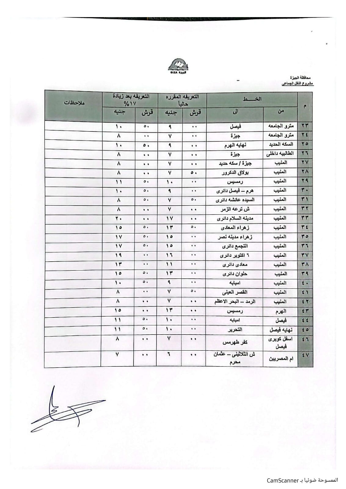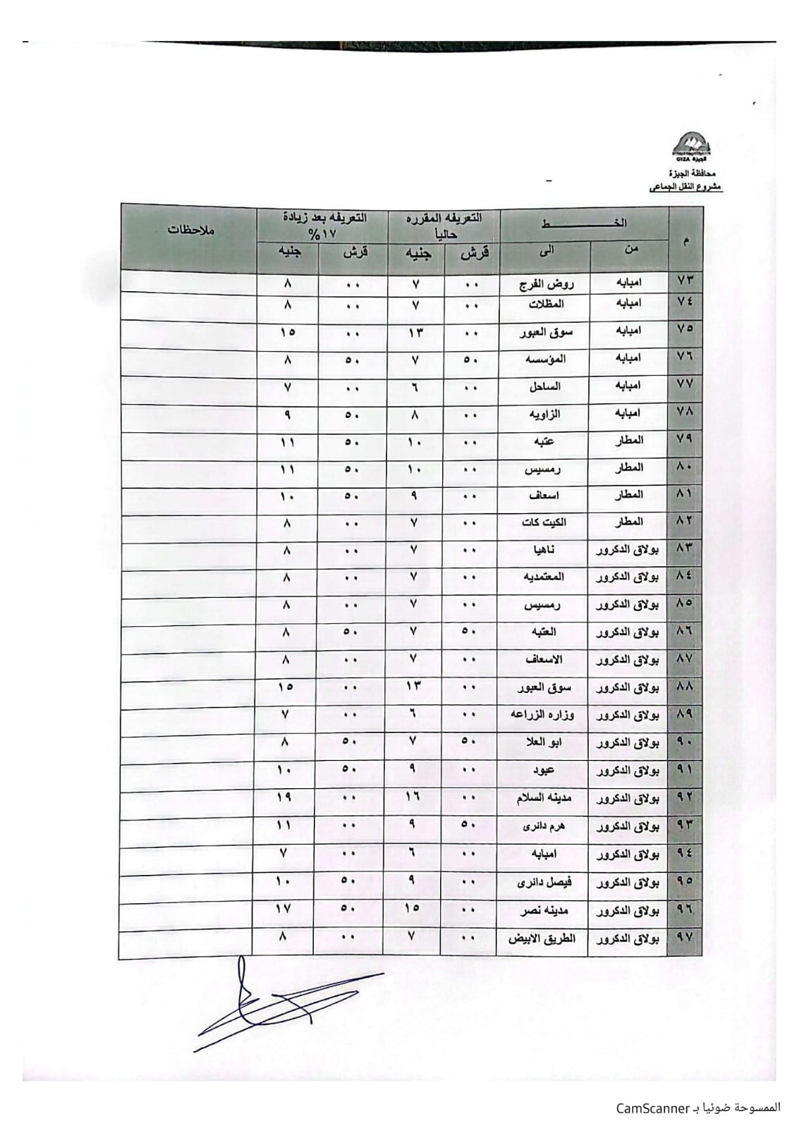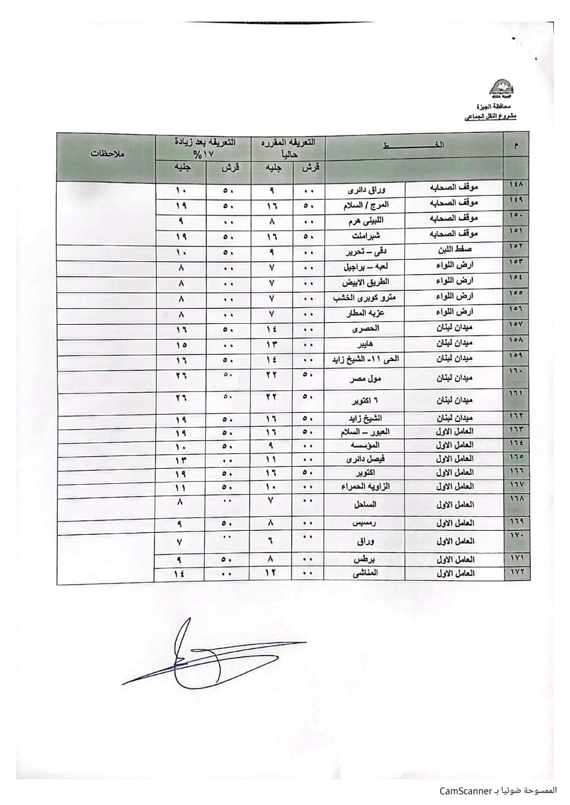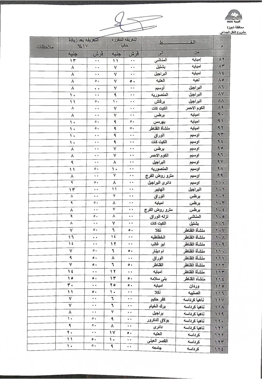 كان قد اعتمد الدكتور أحمد الأنصاري محافظ الجيزة التعريفة الجديدة لسيارات السرفيس والنقل الجماعي الداخلية والخارجية والتي يتم تطبيقها اعتبارًا من اليوم الثلاثاء وطبقًا للجداول المرفقة  وذلك في ضوء قرار لجنة التسعير التلقائي للمنتجات البترولية بوزارة البترول بتحريك أسعار المنتجات البترولية.